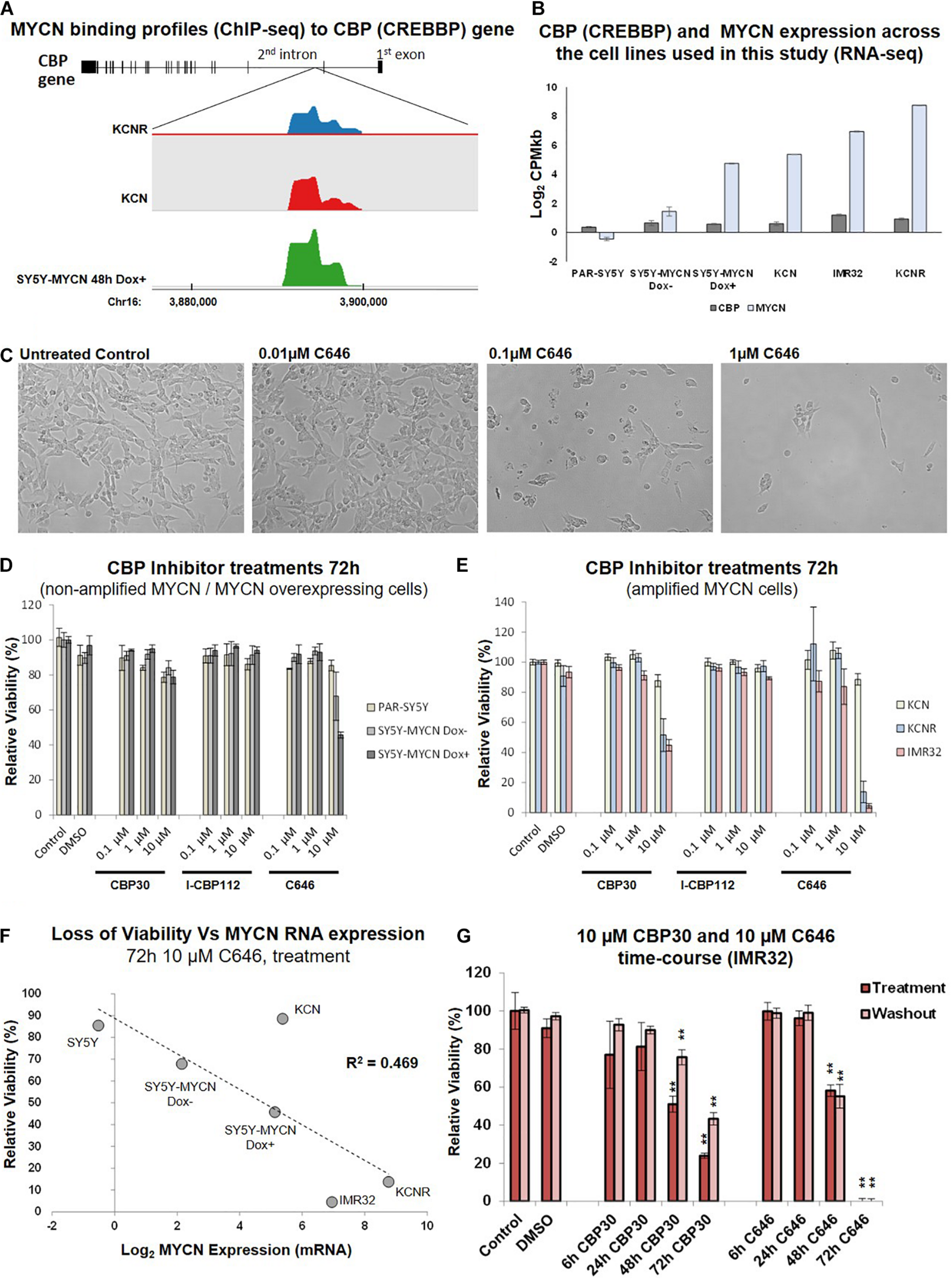 CBP inhibition across a neuroblastoma cell line panel. (A) MYCN binding enrichment within the second intron of the CBP gene. Top – CBP gene schematic representation. Middle – Probe enrichment visualisation for KCNR, KCN, and SY5Y-MYCN 48 h Dox induced representative datasets using the SeqMonk tool. Bottom -genomic coordinates. (B) CBP and MYCN transcript expression levels across the cell line panel. Read counts per million adjusted by gene length in kilobases (CPMkb), obtained from our previously published RNA-seq of these cell lines (Duffy et al., 2015, 2017). (C) Images of IMR32 cells after 48 h treatment with C646. Images were taken with 40x magnification. (D) Relative viability (Alamar Blue assay) upon CBP inhibitor treatment (CBP30, I-CBP112 and C646) of MYCN single copy cell lines, including doxycycline inducible MYCN cell line SY5Y-MYCN. (E) Relative viability (Alamar Blue assay) upon CBP inhibitor treatment (CBP30, I-CBP112 and C646) of MYCN amplified cell lines, including doxycycline inducible MYCN cell line SY5Y-MYCN. (F) Correlation of relative viability loss upon C646 treatment (Alamar Blue assay) and MYCN mRNA expression (Log2 fold change) obtained from RNA-seq (Duffy et al., 2015). R2-value reported on the panel is from a Pearson Correlation Coefficient analysis. (G) Relative viability (Alamar Blue assay) of C646 time-course (6 h, 24 h, 48 h, and 72 h) treatment of MYCN amplified IMR32 cells. Viability results immediately after treatment (Treatment) and after an additional 48 h in the absence of C646 after treatment ended (Washout) are shown. Paired sample t-test values are designated with asterisks above bars. P ≤ 0.05 - *; P ≤ 0.01 - **. Error bars indicate the mean ± SD.