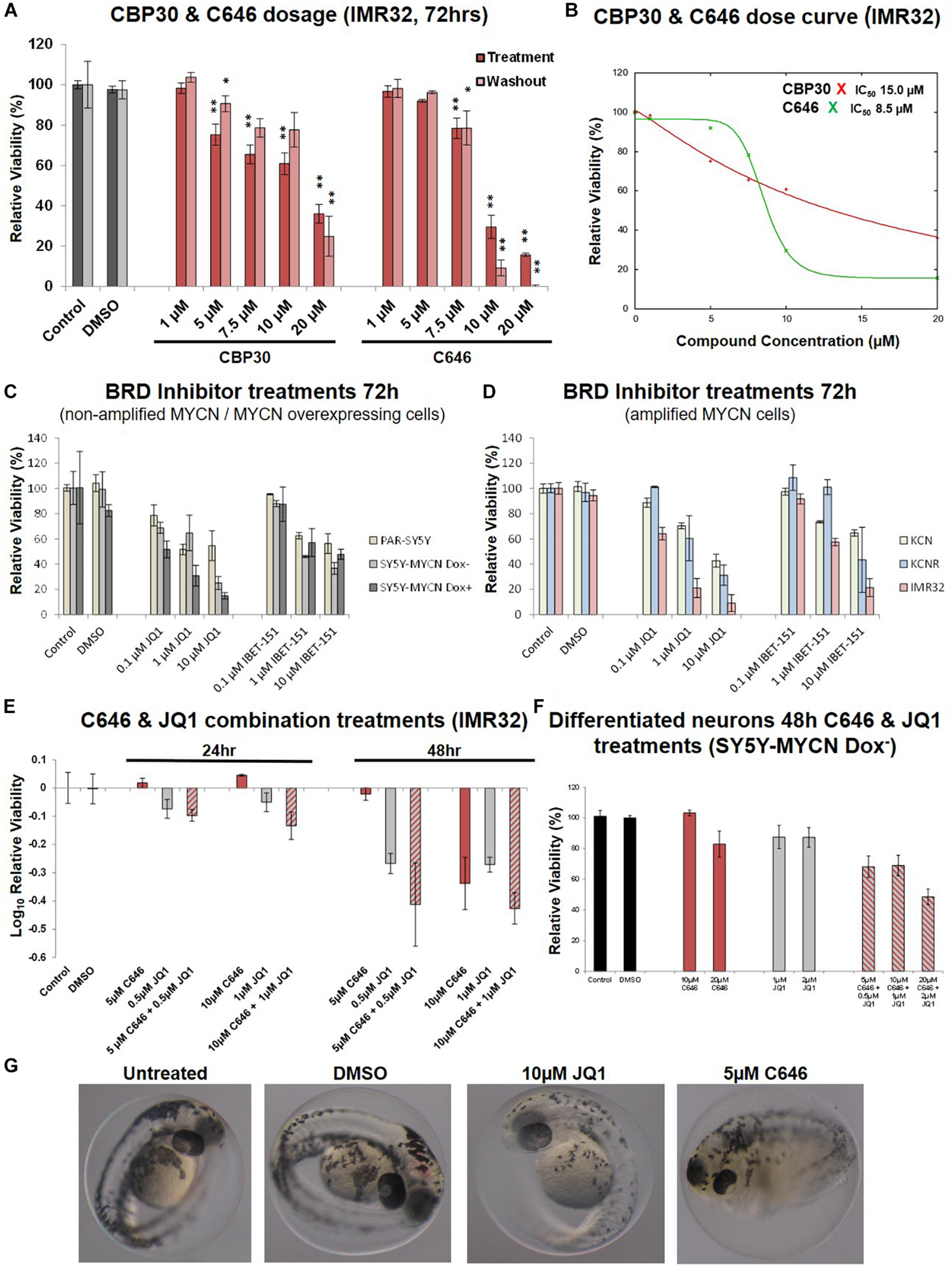 Dose curves, combination treatments, neuronal and phenotypic screens. (A) Expanded dose response assessment of the inhibitors C646 and CBP30 in MYCN amplified IMR32 cells. Relative cell viability was determined using Alamar Blue assays. Viability results immediately after the 72 h treatment (Treatment) and after an additional 48 h in the absence of inhibitors after treatment ended (Washout) are shown. Paired sample t-test values are designated with asterisks above bars. P ≤ 0.05 - *; P ≤ 0.01 - **. Error bars indicate the mean ± SD. (B) IC50 estimate for CBP30 and C646 for the 48h treatment of IMR32 cells. Asterisks correspond to X axis drug concentrations (μM) and Y axis relative cell viability (%). Curve fitting performed with IC Toolkit (http://ic50.tk/index.html). (C) Relative viability (Alamar Blue assay) upon BRD4 inhibitor treatment (JQ1 and I-BET151) of MYCN single copy cell lines, including doxycycline inducible MYCN cell line SY5Y-MYCN. (D) Relative viability (Alamar Blue assay) upon BRD4 inhibitor treatment (JQ1 and I-BET151) of MYCN amplified cell lines, including doxycycline inducible MYCN cell line SY5Y-MYCN. (E) Relative viability (Alamar Blue assay) upon combination CBP and BRD4 inhibitor treatment (C646 and JQ1) of MYCN amplified IMR32 cells. (F) Single agent and combination treatment (C646 and JQ1) of differentiated neurons (pre-inhibitor treatment, 11 day RA treated un-induced SY5Y-MYCN cells). Log10 relative viability (Alamar Blue assay) upon 48 h treatments combination CBP and BRD4 inhibitor treatment (C646 and JQ1) of MYCN amplified IMR32 cells. Error bars indicate the mean ± SD. (G) Zebrafish embryos treated for 24 h (28 h post fertilisation [hpf]- 52hpf) with epigenetic targeting compounds (JQ1 and C646). Magnification is 10x, images from 52 hpf. Melanocytes appear black due to their endogenous melanin. Otic vesicles (large black circles) mark the anterior pole (head) of the embryos.