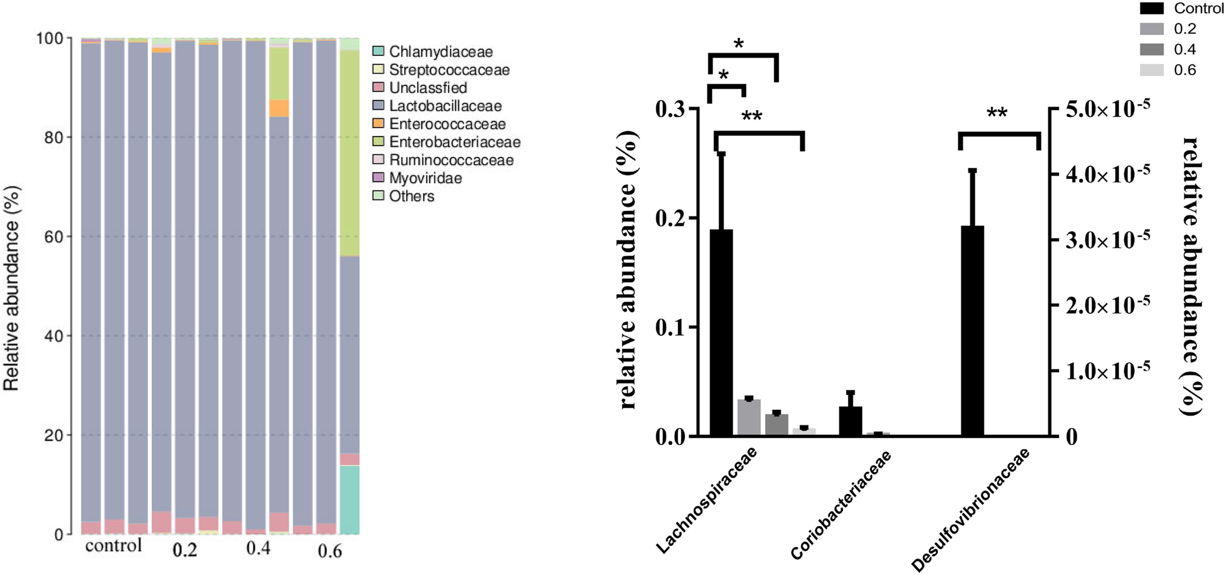 Figure 1. Effect of quercetin on relative abundance of ileal microflora in AA broilers at the family level. Note: The results of relative quantification were expressed as 2– ΔΔCT. The quantification of control was 1, namely 2– ΔΔCT = 1. The value 2– ΔΔCT of treatment group was a multiple of control. N = 3. ∗P < 0.05, ∗∗P < 0.01. Values are mean ± SEM (n = 3).