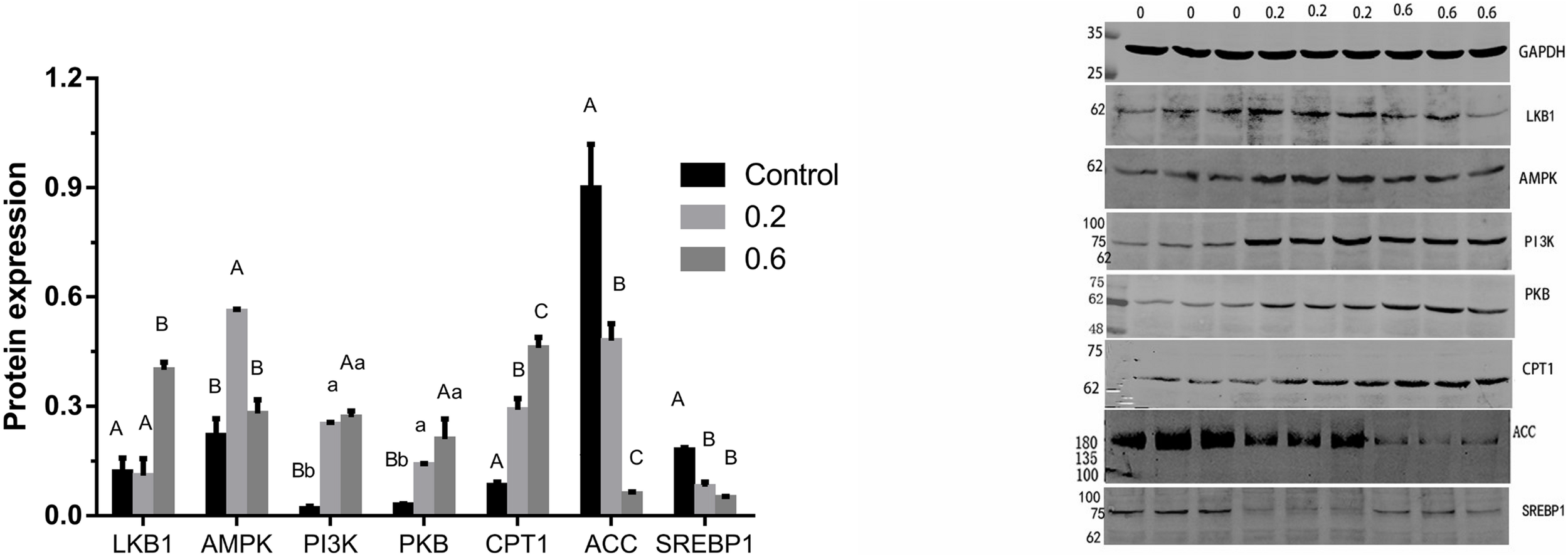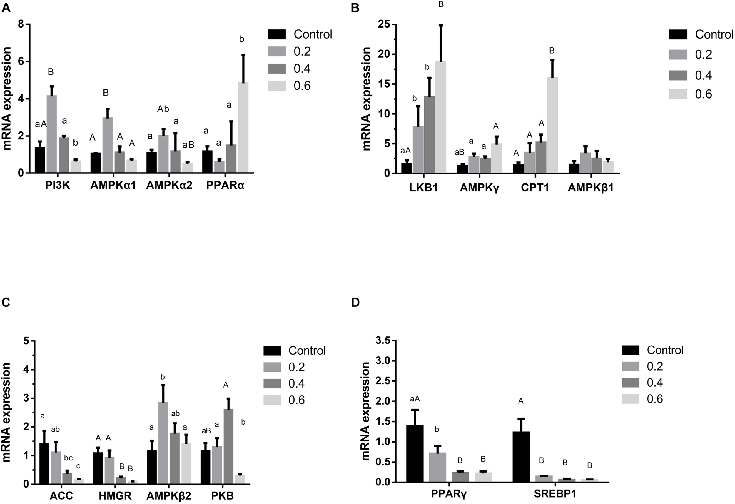 Figure 3. Effects of quercetin on protein relating to the AMPK/PPARα signaling pathway in liver of AA broilers. Note: Data are presented as mean ± SEM (n = 3–5). Bars with different lowercase letters are significantly different (P < 0.05) Bars with different capital letters are significantly different (P < 0.01).