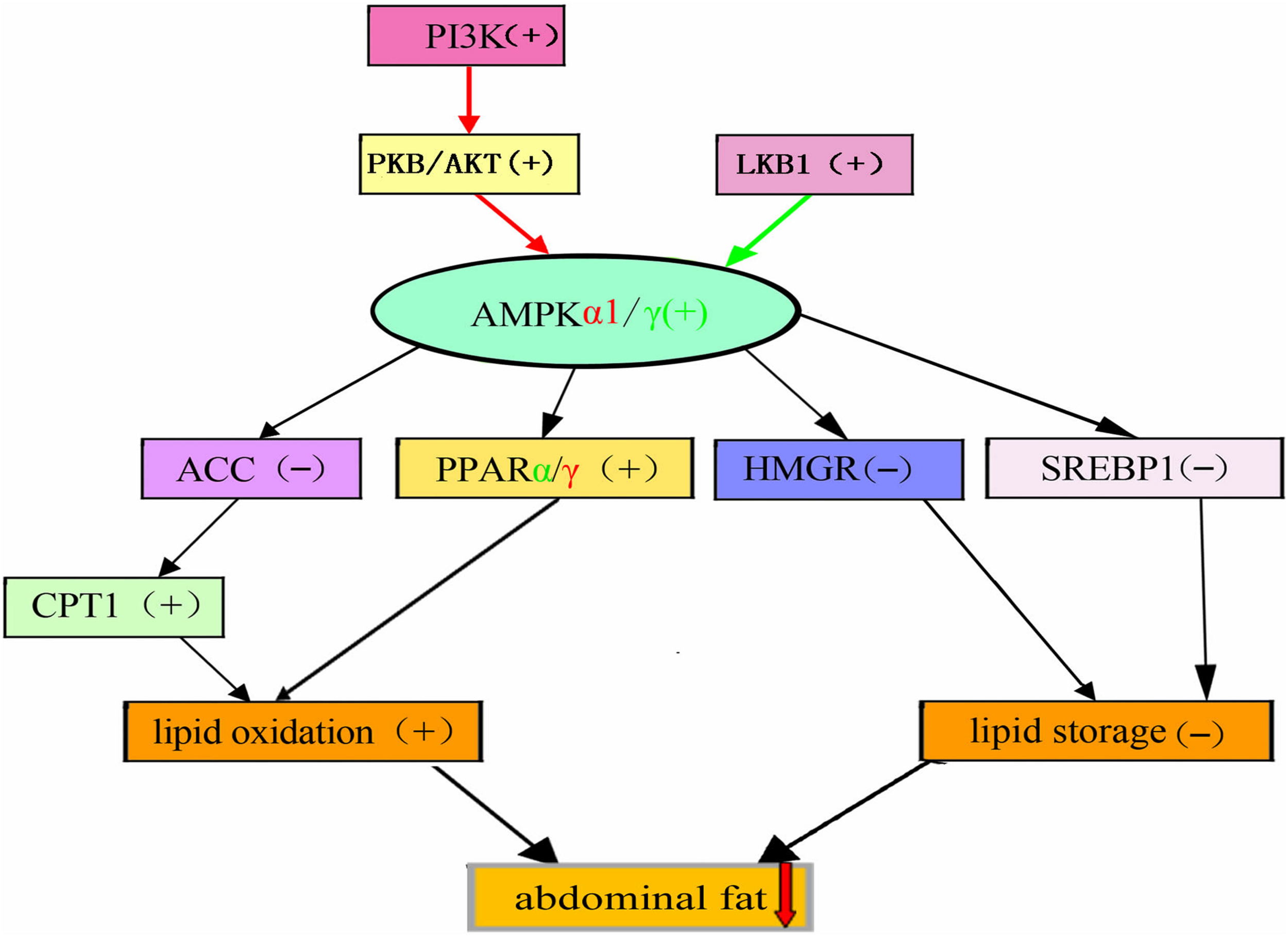 Quercetin reduced the expression levels of SREBP1, PPARγ, and HMGR in liver by activating the AMPK signaling pathway. Consequently, adipogenesis was restricted, thereby reduced lipid synthesis. The present study also found that quercetin decreased ACC expression and increased the expression of CPT1 and PPARα by activating AMPK, thus prevented fatty acid intake and promoted lipolysis and fatty acid oxidation. However, quercetin activated the AMPK signaling pathway through increasing the expression of PI3K, PKB/ATK and LKB1. Therefore, the current results demonstrated that dietary quercetin supplementation improved lipid metabolism, which promoted lipid oxidation and reduced lipid deposition by regulating AMPK/PPAR signaling pathway in liver of broilers (Figure 4).