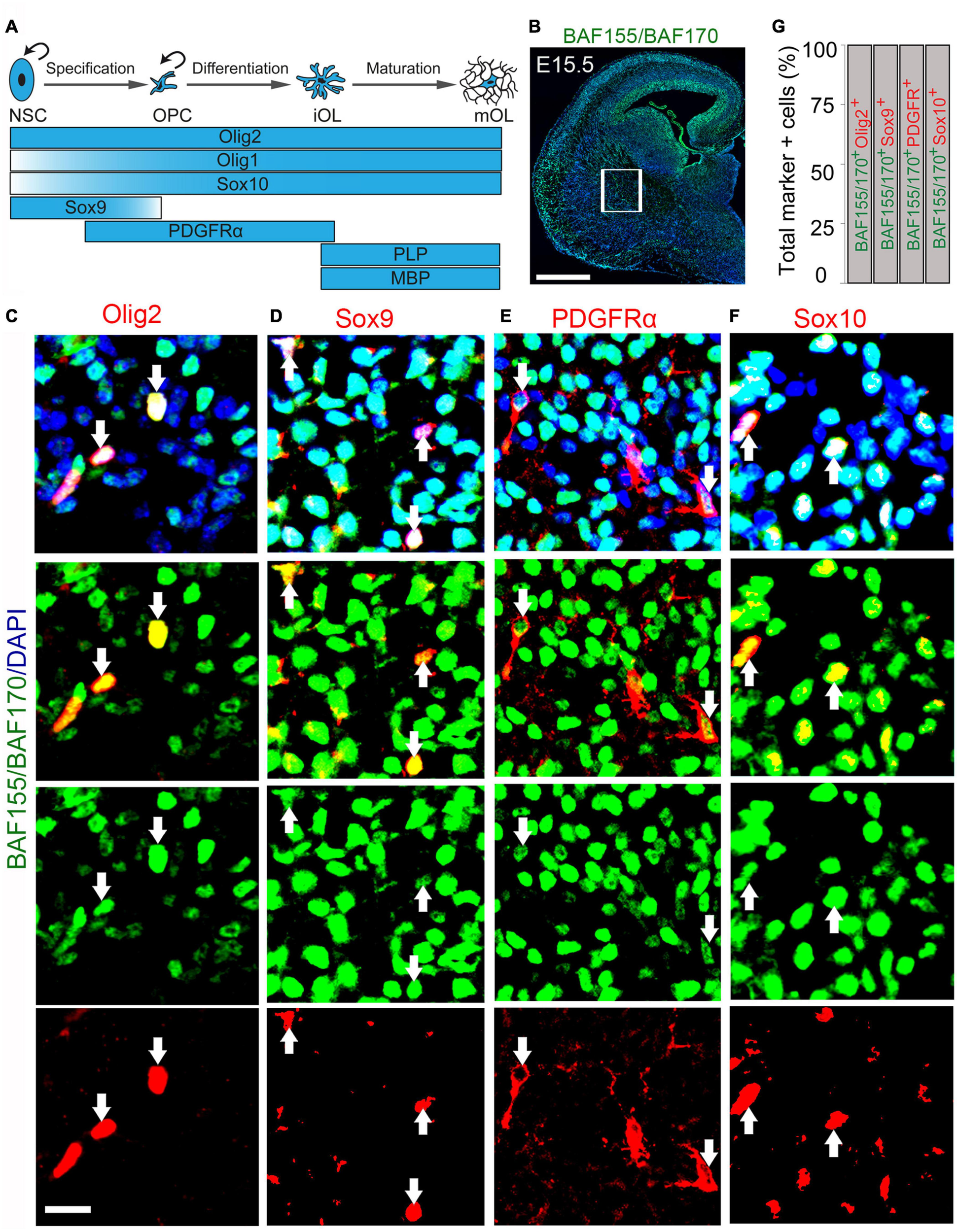 BAF155 and BAF170 expression in the oligodendroglial lineage in the ventral telencephalon. (A) Diagram illustrating the stepwise oligodendrocyte lineage progression and the expression pattern of key molecular drivers. Curved arrows denote proliferation. (B–F) Micrographs showing BAF155 and BAF170 expression (B) alongside the oligodendrocyte lineage markers Olig2, Sox10 for pan-oligodendrocyte (C,F), Sox9 for glioblasts (D), and PDGFRα for OPCs (E) in coronal sections of the mouse forebrain at E15.5 using immunohistochemistry. (G) Bar graph showing quantitative estimation of proportion of Olig2, Sox9, PDGFRα, and Sox10 positive cells with BAF155 and BAF170 expression. Inserted box shows selected area for quantification. Arrows refer to the oligodendrocytic lineage expressing BAF155 and BAF170. Experimental replicates (n) = 3. NSC, neural stem cell; OPC, oligodendrocyte precursor cell; iOL, immature oligodendrocyte, mOL, mature oligodendrocyte. Scale bars = 200 μm (B), 25 μm (C), 50 μm (D–F).