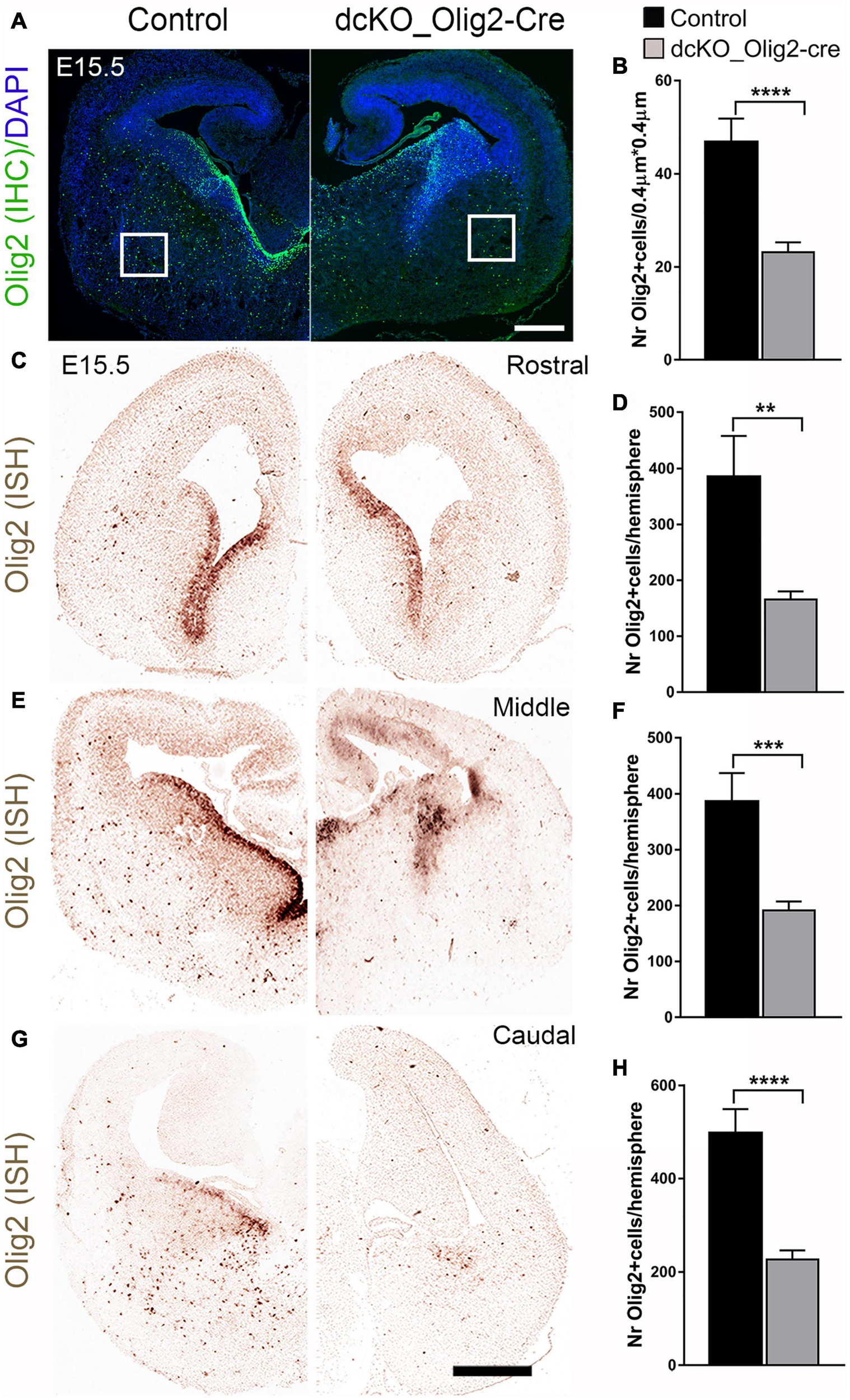 Decrease in the number of Olig2-expressing cells due to loss of BAF155 and BAF170 in ventral telencephalon. (A,B) Immunohistochmical micrograph (A) and quantitative analyses (B) indicating diminished number of Olig2+ cells caused by loss of BAF155 and BAF170. (C,E,G)In situ hybridization micrographs using Digoxigenin-labeled Olig2 RNA probes in the control and dcKO_Olig2-Cre E15.5 mouse telencephalon along the rostral–caudal axis. (D,F,H) Statistical analyses indicate significant depletion of Olig2+ cells in the rostral middle, and caudal levels of the dcKO_Olig2-Cre mutant telencephalon compared with control. Data are expressed as means ± SEMs. Experimental replicates (n) = 6; **p ≤ 0.01, ***p ≤ 0.001, ****p ≤ 0.0001. Scale bars = 200 μm (A), 100 μm (D).