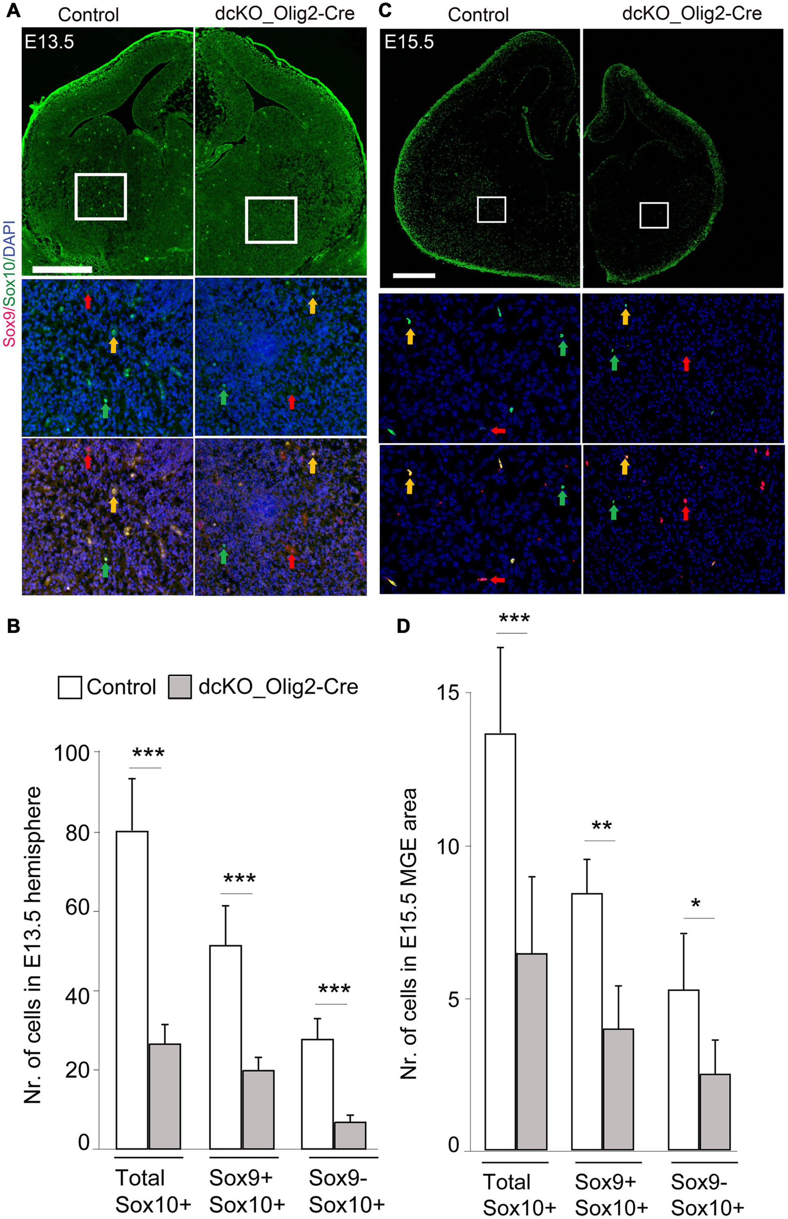 Specification of oligodendrocyte precursors is impaired in the dcKO_Olig2-Cre. (A,C) Immunomicrographs showing Sox9 and Sox10 in the E13.5 (A) E15.5 (C) control and dcKO_Olig2-Cre forebrain. Selected regions of the striatum are shown at higher magnification. Yellow arrows point to cells co-expressing Sox9 and Sox10. Green arrows point to cells expression only Sox10. Red arrows point to cells expressing only Sox9. DAPI counter staining is shown. (B,D) Bar plots showing statistical difference in the number of cells (co)expressing Sox9, Sox10, or Sox9/Sox10 in the E13.5 (B) E15.5 (D) control and dcKO_Olig2-Cre forebrain. Data are shown as means ± SEMs. Experimental replicates (n) = 6; *p ≤ 0.01, **p ≤ 0.001, ***p ≤ 0.0001. Scale bars = 100 μm.