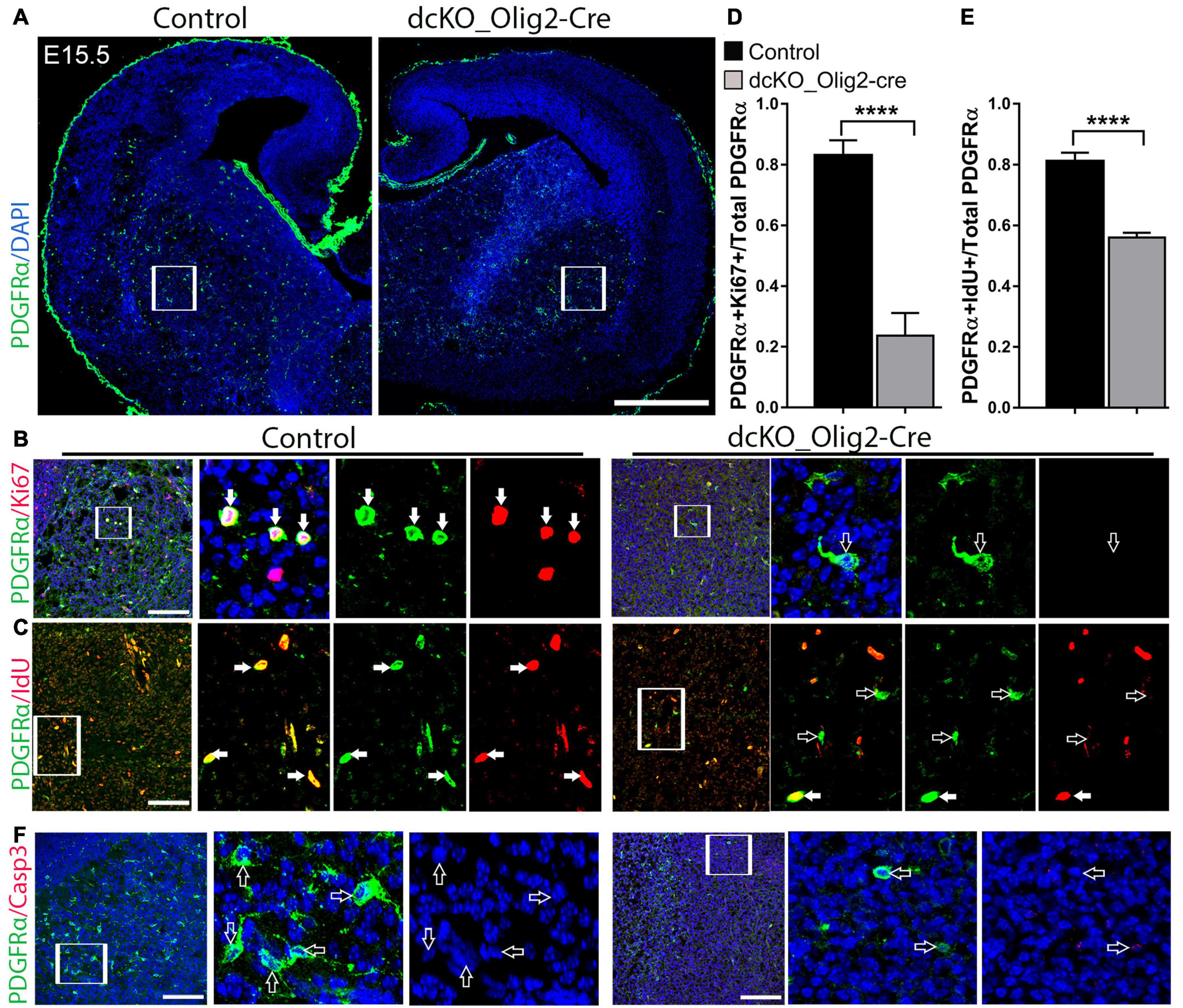 Since most of the mutant OPCs are abnormally non-proliferative and depleted in number, we were curious to find out whether apoptosis plays a role in the observed phenotype. Our investigation of apoptotic activity using immunohistochemical staining of Casp3, a protein maker for apoptosis, revealed comparable Casp3 staining in the E15.5 striatum in the control and dcKO_Olig2-Cre forebrain (Supplementary Figures 5F,G).