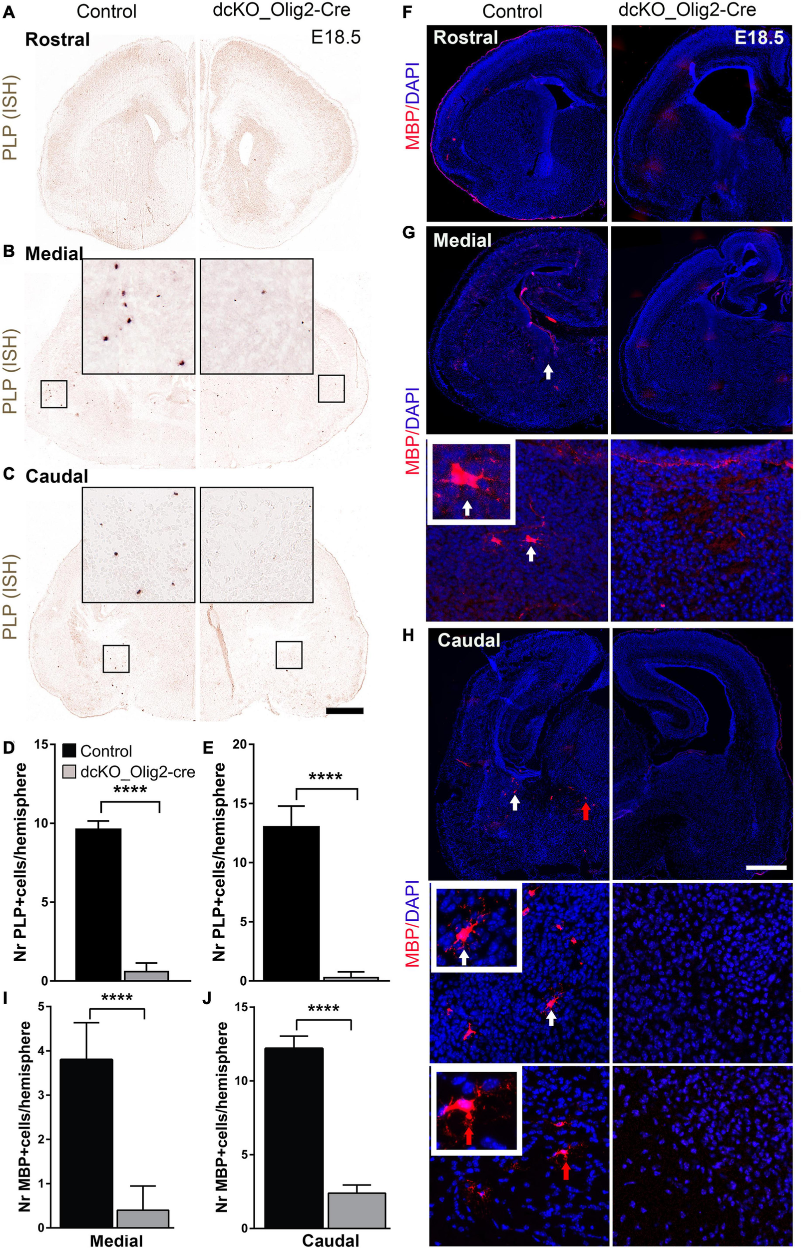 Number of PLP+, MBP+ oligodendrocytes is reduced in dcKO_Olig2-Cre mutant forebrain at E18.5. (A–C)In situ hybridization images showing the E18.5 control and dcKO_Olig2-Cre forebrain coronal sections with riboprobed for PLP expression. (D,E) Bar charts showing quantification of PLP-expressing cells in the E18.5 control and dcKO_Olig2-Cre at the middle (D), and caudal (E) levels of the ventral telencephalon Experimental replicates (n) = 5, Scale bars = 100 μm. (F–H) Micrographs showing the rostral, middle, and caudal sections of the E18.5 mouse forebrain immunostained with MBP and with DAPI counterstaining. Inserted images are higher magnification of MBP-expressing cells indicate by white and red solid arrows. (I,J) Bar graph showing significantly diminished number of cells expression MBP in the E18.5 control striatum compared with that of dcKO_Olig2-Cre. Note that PLP+, MBP+ cells are very rare in E18.5 control and dcKO_Olig2-Cre forebrain at rostral level and are not included in statistical analysis. Data are presented as means ± SEMs; ****p ≤ 0.0001); Experimental replicates (n) = 6. Scale bars = 100 μm.