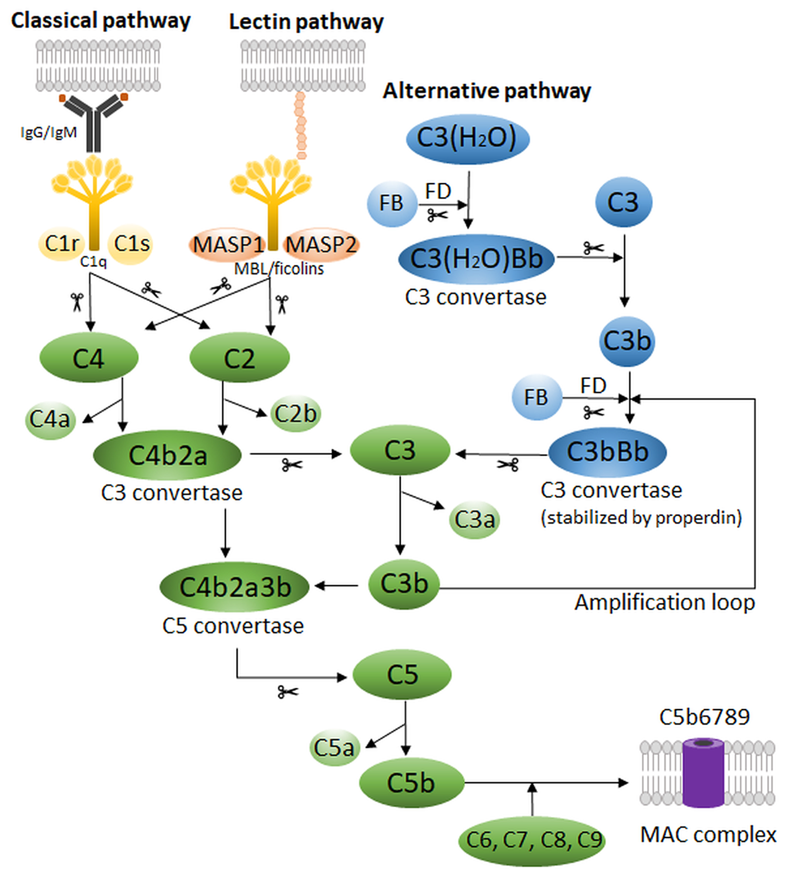 Schematic representation of the human complement system, which possesses three main pathways: the classical, the lectin and the alternative pathway. Scissors indicate proteolytic cleavage. FB, Factor B; FD, Factor D; MAC, membrane attack complex; MASP, MBL-associated serum protease; MBL, mannose-binding lectin.