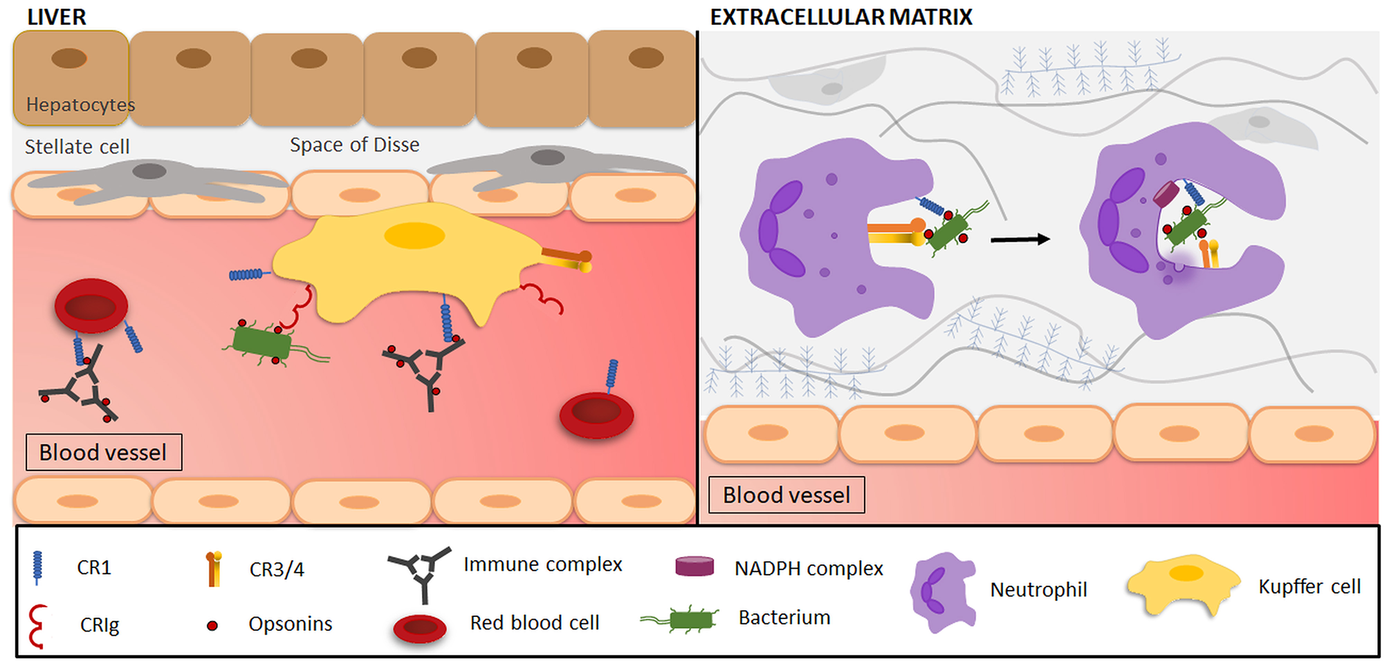 Complement-mediated phagocytosis in the clearance of microorganisms and immune complexes. (Left side) Resident liver macrophages (Kupffer cells/KCs) engulf pathogens, immune complexes and various other particles through interactions with complement receptors. Opsonized (red dots) immune complexes (ICs) are transported to the liver via CR1 on the plasma membrane of circulating red blood cells (RBCs). In the liver, ICs interact with CR1 and scavenger receptors (not shown) on KCs, leading to IC phagocytosis, where after RBCs return to the circulation. Opsonized and free pathogens are recognized by CRIg on KCs and are subsequently engulfed. (Right side) Phagocytes (e.g., neutrophils) are attracted to a site of infection and reach the extracellular matrix by transmigrating across the endothelium. Once there, CR1 on neutrophils will be involved in the attachment of C3-opsonized particles to the cell, after which interaction with CR3 mediates phagocytosis. As the plasma membrane surrounds the target, forming a phagosome, the activation of the nicotinamide adenine dinucleotide phosphate (NADPH) complex and degranulation of neutrophilic granules initiate target degradation.