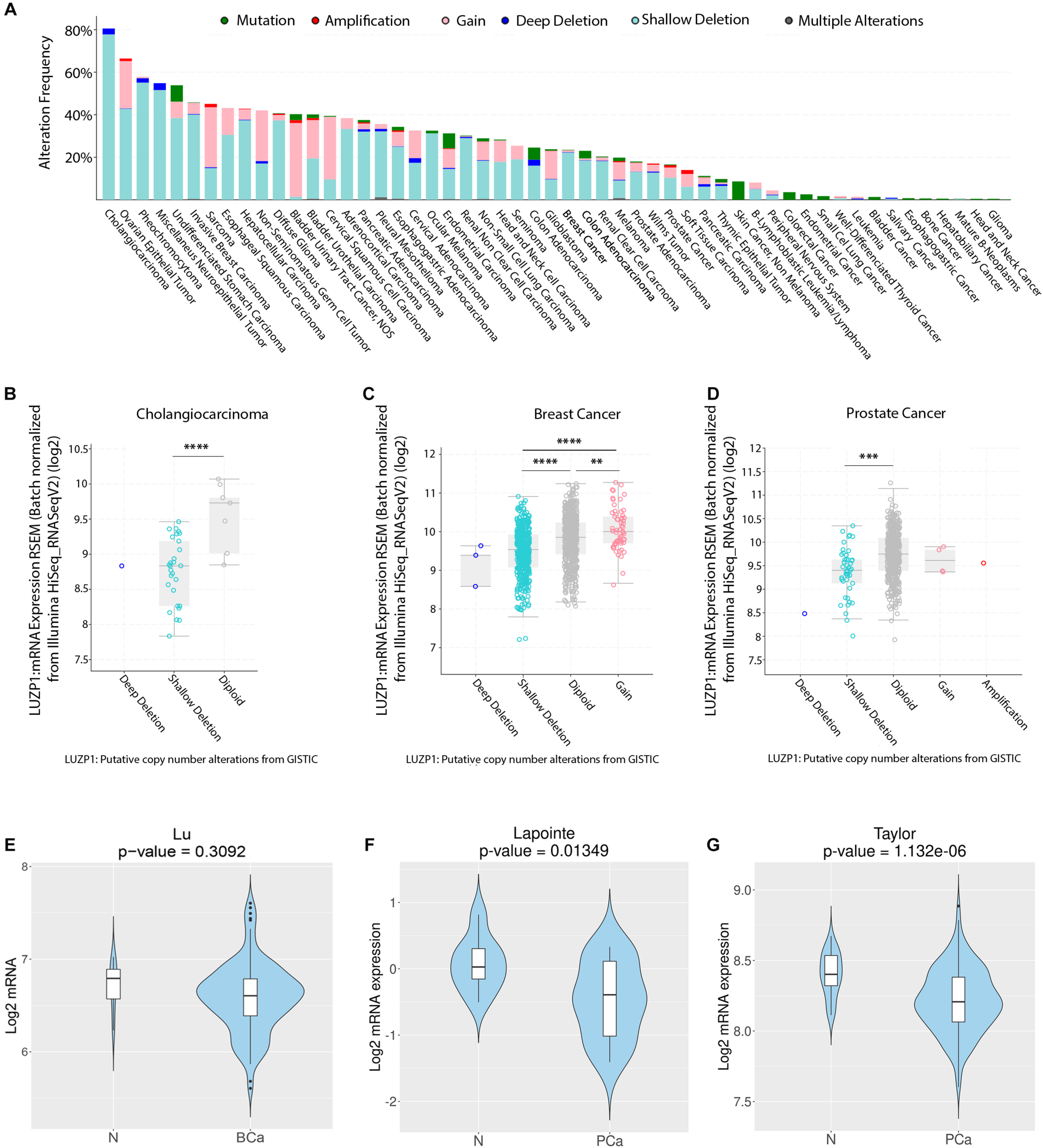 Copy number alterations and aberrant LUZP1 gene expression in cancer. (A) Copy number alterations (CNA) (mutations-green; amplifications-red; gain-light pink; deep deletions-blue; shallow deletions-aquamarine; multiple alterations-gray) in different TCGA tumor types (n = 10,967). (B–D)LUZP1 mRNA expression (RNAseq) sorted by CNA in (B) Cholangiocarcinoma (n = 195), (C) Breast (n = 1,918), and (D) Prostate Cancer samples (n = 324). When n > 3, data were analyzed by One-way ANOVA or Kruskall-Wallis and the corresponding post hoc test. (E) Violin plots depicting the expression of LUZP1 between non-tumoral (N) and breast cancer specimens (BCa) in the Lu dataset (Lu et al., 2008). (F,G) Violin plots depicting the expression of LUZP1 between non-tumoral (N) and prostate cancer specimens (PCa) in Lapointe et al. (2004)(F) and Taylor et al. (2010)(G) datasets. The Y-axis represents the Log2-normalized gene expression (fluorescence intensity values for microarray data or sequencing read values obtained after gene quantification with RSEM and normalization using Upper Quartile in case of RNAseq). Student T-test was performed in order to compare the mean gene expression between two groups. ∗∗P < 0.01; ∗∗∗P < 0.001; ****P < 0.0001.