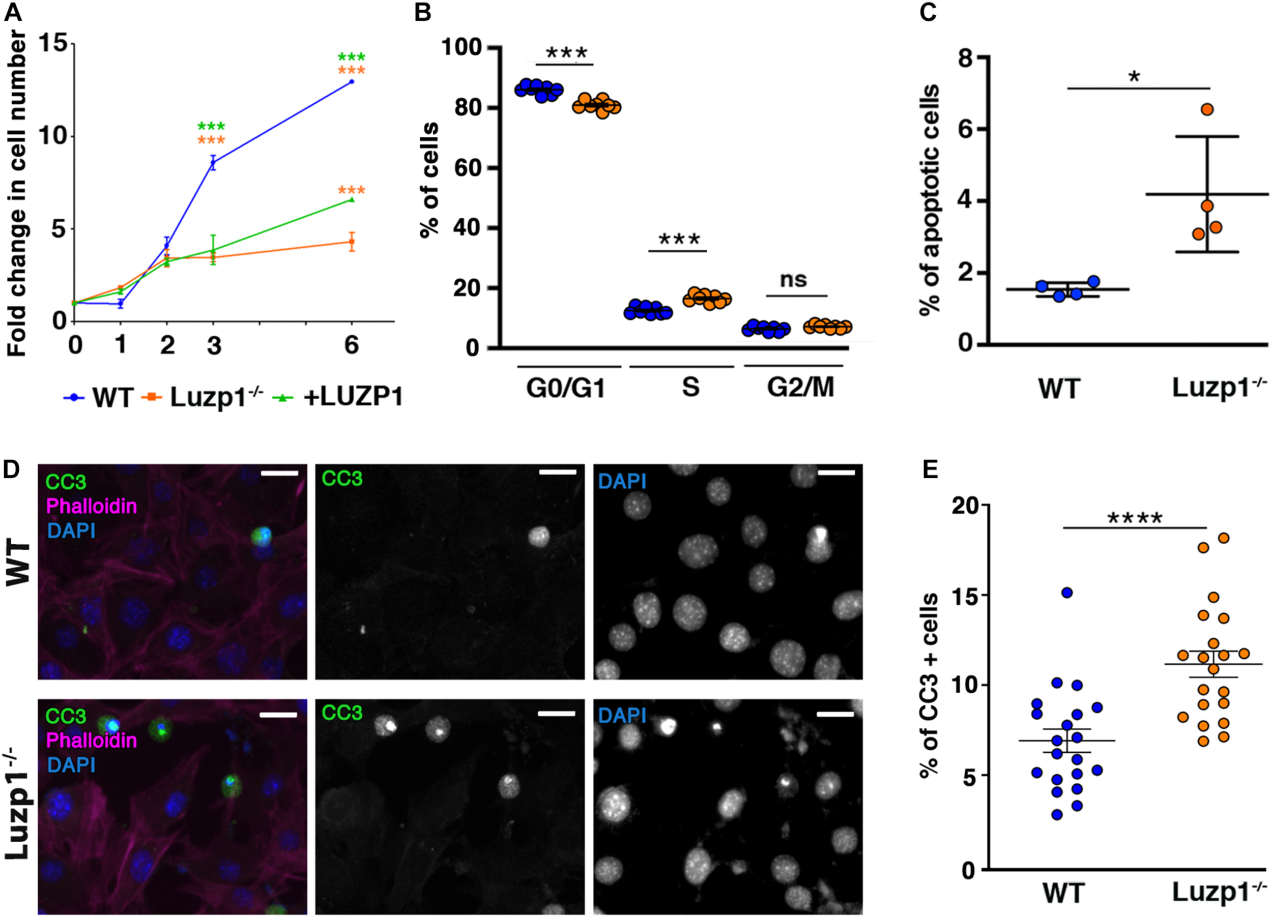 Luzp1–/– cells exhibit lower viability and higher apoptosis than WT. (A) Graphical representation of fold change in cell numbers of WT (n = 5; blue line), Luzp1–/– (n = 5; orange line) and + LUZP1 cells (n = 5; green line). P-values were calculated using Two-way ANOVA and Sidak’s multiple comparisons test. (B) Graphical representation of the percentage of WT (blue dots) and Luzp1–/– cells (orange dots) in G0/G1, S or G2/M phases analyzed by EdU labeling and QIBC. P-values were calculated using Two-way ANOVA. (C) Graphical representation of the results of FACS analysis in Supplementary Figure S1B using Annexin V and DRAQ7 staining to determine the percentage of apoptotic cells in WT and Luzp1–/– cells in (n = 4). P-value was calculated using Mann Whitney-U test. (D) Representative micrographs showing WT and Luzp1–/– cells stained with the marker of mid-stage apoptosis cleaved caspase-3 (CC3) (green), phalloidin (magenta), and DAPI (blue). Black and white images show the single green and blue channels. Images were detected using Zeiss fluorescence microscope (Axio Imager D1), × 40 objective. Scale bar: 25 μm. (E) Graphical representation of quantification of CC3-positive cells in (D) showing the percentage of apoptotic cells in WT and Luzp1–/– cells (n = 20 micrographs, objective 20x). P-value was calculated using Mann Whitney-U test. The graphs in (A–C,E) represent the Mean and SEM. ∗P < 0.05; ∗∗∗P < 0.001; ****P < 0.0001.