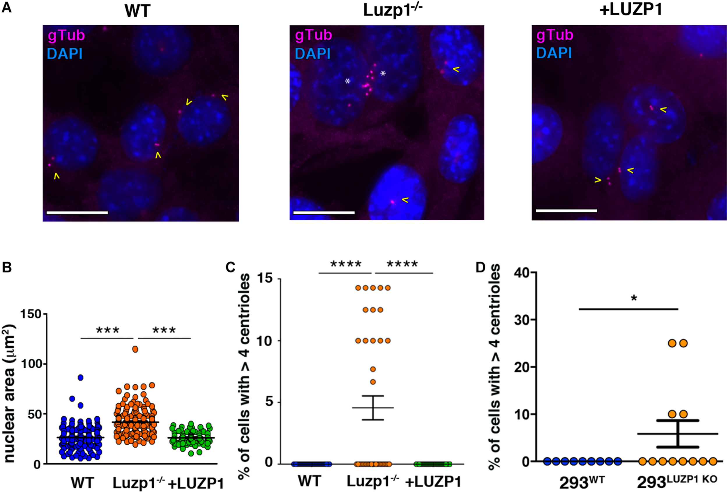 Luzp1–/– cells exhibit bigger nuclei and multiple centrioles. (A) Micrographs showing centrioles in wild-type Shh-LIGHT2 cells (WT), Shh-LIGHT2 cells lacking Luzp1 (Luzp1–/–) and Luzp1–/– cells rescued with Luzp1-YFP (+ LUZP1) analyzed during cycling conditions. Centrioles were visualized using gamma-tubulin antibody (gTub, magenta) and nuclei were counterstained using DAPI (blue). Scale bar, 5 μm. Cells containing 2 centrioles are marked with yellow arrowheads and those containing multiple centrioles with white asterisks. (B) Graphical representation of nuclear area of Shh-LIGHT2 WT (n = 178 micrographs; blue dots), Luzp1–/– (n = 185 micrographs; orange dots) and + LUZP1 cells (n = 90 micrographs; green dots). P-values were calculated using Kruskall-Wallis and Dunn’s multiple comparisons tests. (C) Graphical representation of the percentage of cells that exhibit more than 4 centrioles in (A). WT, n = 37 micrographs, blue dots; Luzp1–/–, n = 38 micrographs, orange dots; + LUZP1, n = 35 micrographs, green dots. P-values were calculated using Kruskall-Wallis and Dunn’s multiple comparisons tests. (D) Graphical representation of the percentage of cells that exhibit more than 4 centrioles in wild-type HEK 293FT (293WT) and HEK 293FT cells lacking Luzp1 (293LUZP1KO). 293WT, n = 9 micrographs, blue dots; 293LUZP1KO, n = 12 micrographs, orange dots. P-values were calculated using Mann Whitney-U test. The graphs in (B–D) represent the Mean and SEM. ∗P < 0.05; ∗∗∗P < 0.001; ****P < 0.0001.