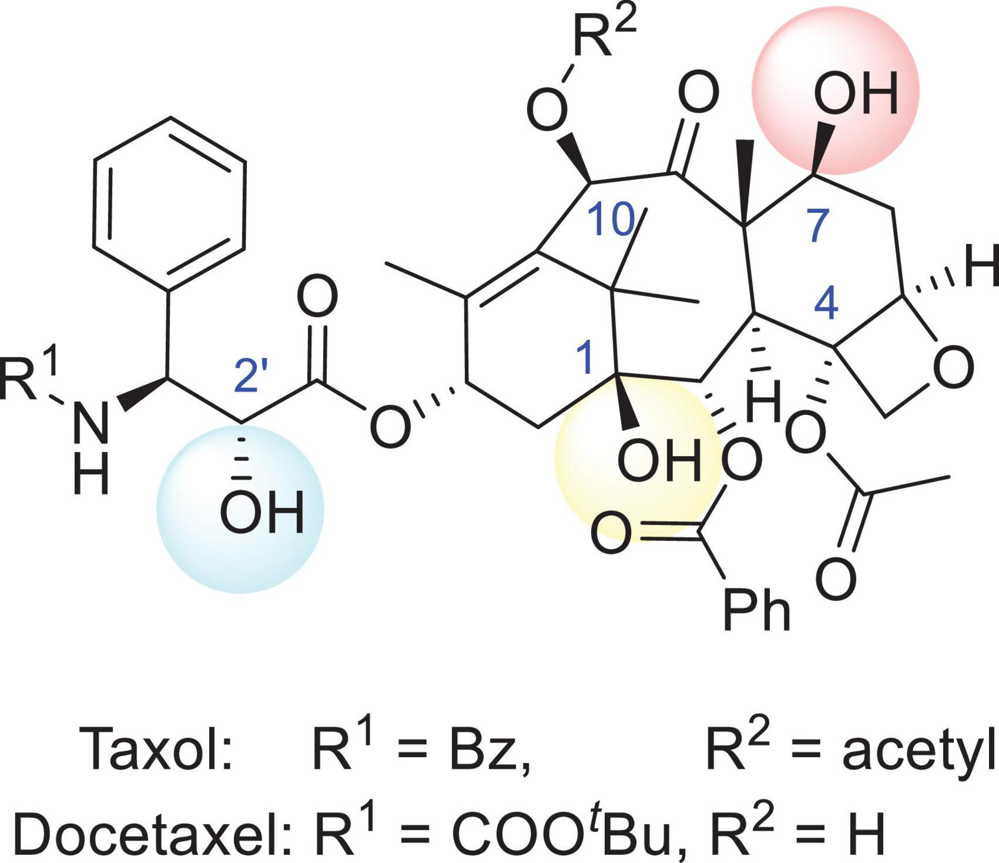 Structure–activity relationship (SAR) studies of PTX have been systematically undertaken in the past three decades and are emphasized in the following sections (shown in Figure 1). Removal or replacement of either the hydroxyl group attached to carbon 1 (1-hydroxyl group) or the 2-acyl and 4-acyl groups of PTX reduces the bioactivity. The oxygen-containing heterocyclic ring is the pharmacophore. Notably, the 7-hydroxyl, 10-acetyl, and acetyloxy groups are the least important groups, so these regions can be further modified for multifunctional group introduction or removal. Reduction of the 9-carbonyl group leads to a slight enhancement in bioactivity. Hydroxyl or hydrolyzable ester groups should be bonded to carbon 2′, while phenylation or arylation requires linkage to carbon 3′. In addition, carbon 3′ must bear an amide group (Georg et al., 1992; Wahl et al., 1992; Georg and Cheruvallath, 1994; Kingston, 1994; Nicolaou et al., 1995; Gunatilaka et al., 1999). Although PTX has a bright future in chemotherapy, some inherent properties, including its poor aqueous solubility (≤0.4 M), have brought about many side effects in vivo. Aiming to identify analogs with better aqueous solubility, French pharmaceutical giant Sanofi developed the second-generation antitumor agent docetaxel (DTX) in 1996, which is structurally related to PTX. Compared with PTX, hydroxyl groups instead of acetyl or acetyloxy groups were tied to carbon 10 in DTX to increase the aqueous solubility. The benzoxy group on the amide side chain adjacent to the 3′ carbon was converted into tert-butyl carbamate (shown in Figure 1). Additionally, the formulation of PTX commonly used in clinical settings is diluted with polyoxyethylated castor oil (Cremophor EL) in a 1:1 v/v mixture with absolute ethanol before intravenous administration. Notably, a solubilizer combination composed of polysorbate 80 and alcohol used for DTX administration has been shown to be less susceptible to producing an allergic response, so doctors have usually tended to recommend using DTX once irritation occurs (Hanauske et al., 1992; New et al., 1996).