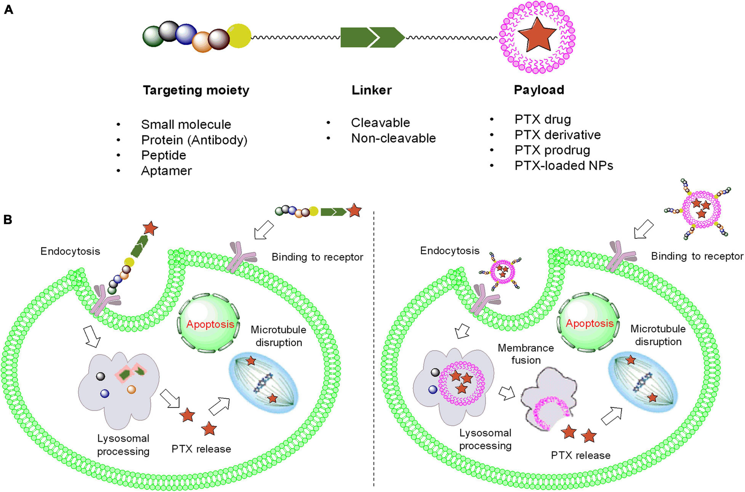 The framework and functional mechanism of ligand-PTX drugs. (A) The composition of ligand-PTX drugs. (B) Endocytosis of ligand–PTX conjugates and ligand-coated NPs with a PTX payload.