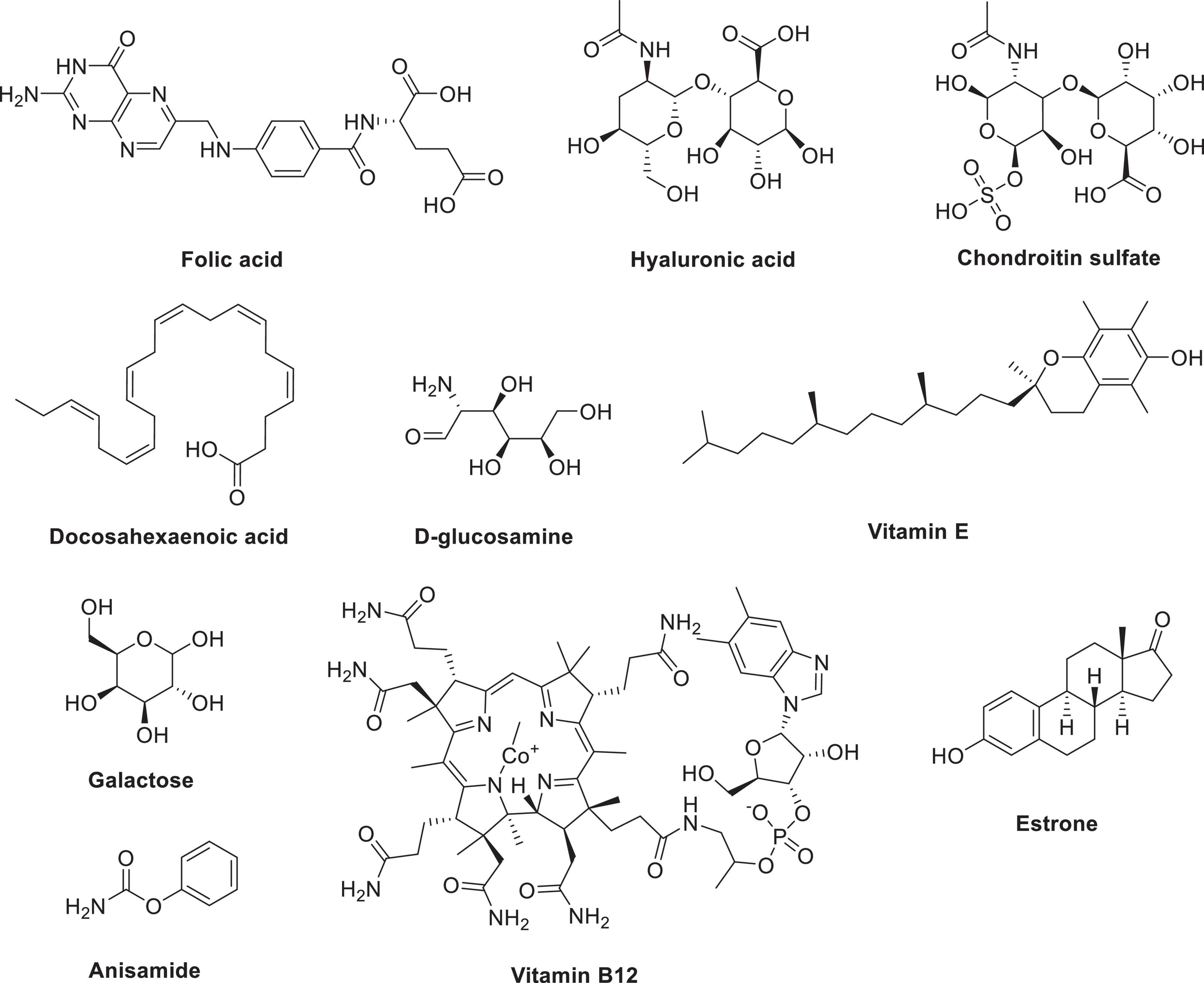The frequently used small-molecule ligands are shown in Figure 3. Due to the high affinity of ligands to their targets, small molecule-drug conjugates (SMDCs) have successfully enhanced the specificity of the cytotoxic payload toward tumors. SMDCs can distribute into tumor tissues rapidly with no immunogenicity (Srinivasarao and Low, 2017; Lee et al., 2018; Zhuang et al., 2019). In addition, SMDCs can quickly bind to the receptor and be cleared by the kidneys within 1 h (Srinivasarao and Low, 2017). The ligands are generally obtained by high-throughput screening, but this strategy involves a high cost and gives a low probability of success. In recent years, with the increase in DNA-encoded libraries, the availability of ligands has greatly improved. Although there have been no SMDCs approved by the FDA, some of these compounds have entered preclinical or clinical trials. For example, vintafolide [a vinblastine-folic acid (FA) conjugate], developed by Merck Sharp & Dohme Ltd. and Endocyte Ltd., failed in a phase III clinical trial, suggesting that SMDCs are still immature (Vergote and Leamon, 2015).