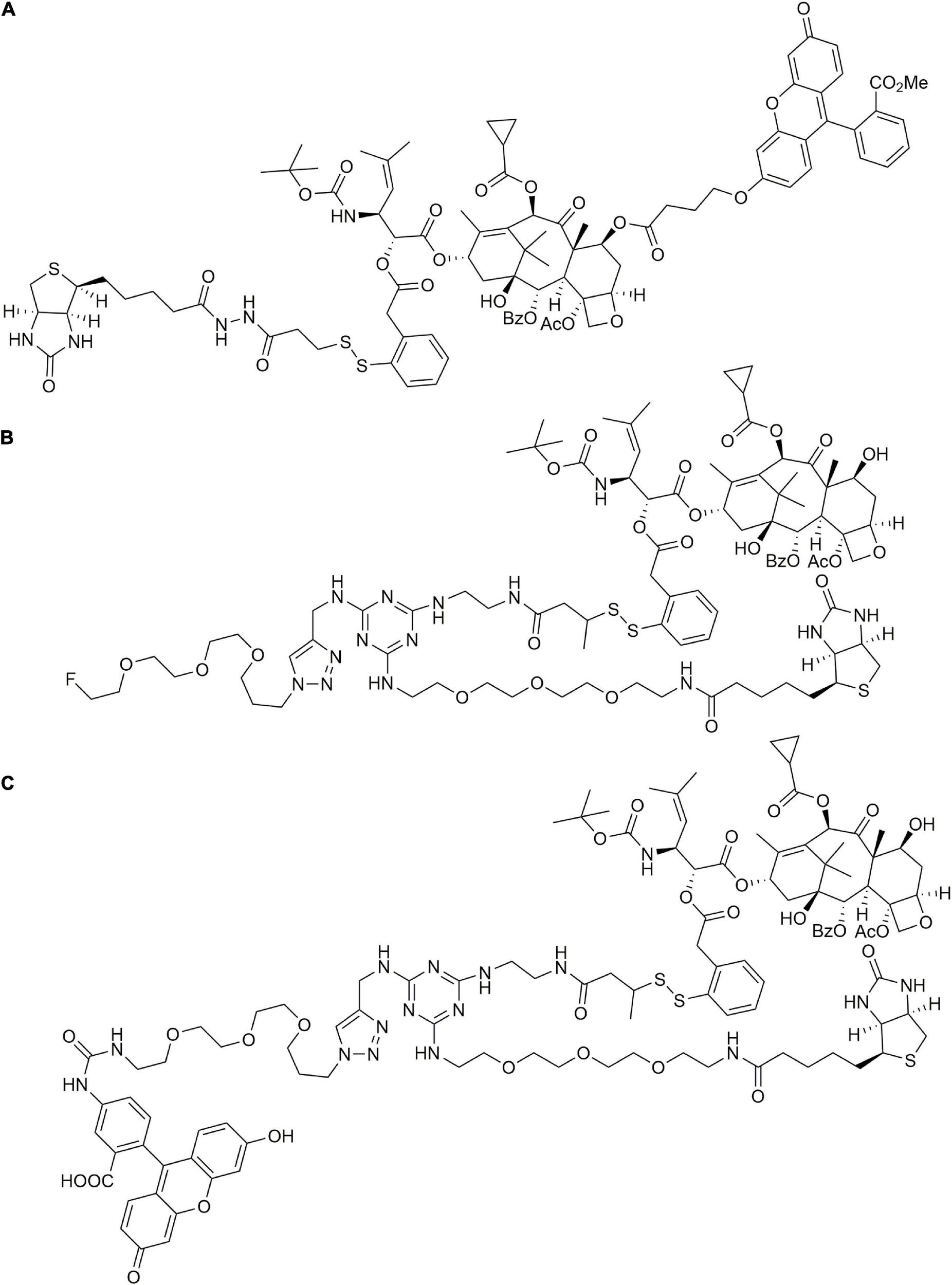 The Ojima group used tumor-targeting ligands such as docosahexaenoic acid (DHA), a polyunsaturated fatty acid, coupled with PTX to form DHA–PTX conjugates (shown in Figure 4). It was found that both conjugates DHA-Taxol-1 and DHA-Taxol-2 exhibited strong inhibition against DLD-1 xenografts and achieved total regression of drug-resistant and drug-sensitive tumors (Kuznetsova et al., 2006; Ojima, 2008). This group also designed fluorescently labeled redox-sensitive biotin–PTX conjugates, which were used as fluorescent probes to study the physiological and biochemical properties in biological samples and the mechanism of drug delivery through receptor-mediated endocytosis (RME) (Ojima et al., 2012) (shown in Figure 5A). Three years later, they introduced another two novel tumor-targeting conjugates bearing either a fluorine-labeled prosthetic as a potential 18F-positron emission tomography (PET) radiotracer or a fluorescent probe for internalization studies in a tumor-targeted drug delivery system in vitro (Vineberg et al., 2015) (shown in Figures 5B,C). Through assays, they found that in the presence of glutathione ethyl ester, only the fluorine-labeled prosthetic conjugate entered cells through the RME on the first day, exerting excellent cytotoxicity and selectivity.