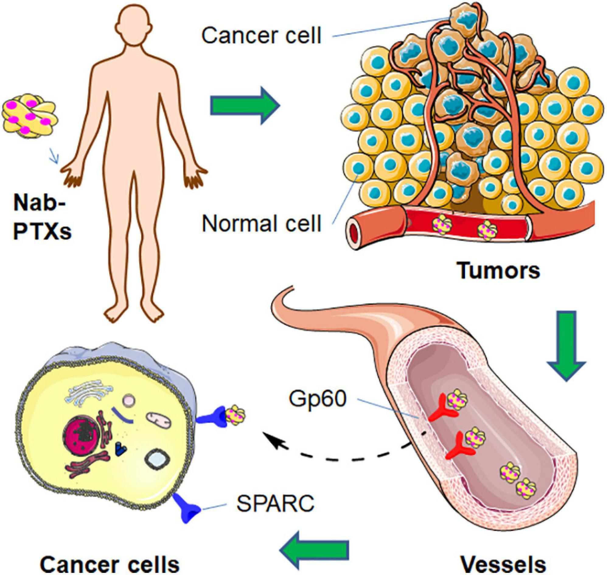 Albumin is an endogenic serum protein. It accounts for over 60% of the total proteins in plasma and plays a very important role in various physiological functions (Jupin et al., 2013). Human serum albumin (HSA) has a preferential affinity for hydrophobic moieties and also shows biocompatibility, and thus, it has been exploited as a perfect delivery system for drug transportation. NP albumin-bound PTX (nab-PTX, Abraxane) is becoming the most important targeted chemotherapeutic drug for many types of cancer treatments. One kind of 60-kDa sialoglycoprotein (gp60) and secreted protein acidic and rich in cysteine (SPARC), an albumin receptor, are highly expressed on the surface of endothelial cells and cancer cells, respectively (Iglesias, 2009; Zhu et al., 2016). As shown in Figure 6, nab-PTX could first recognize gp60 in the endothelia and then activate the caveolin-1 process. After transportation into the tumor interstitium via the caveolae-mediated pathway, nab-PTX could bind to SPARC, facilitating the release of PTX around cancer tissues and improving the anticancer effects (Abu Samaan et al., 2019).
