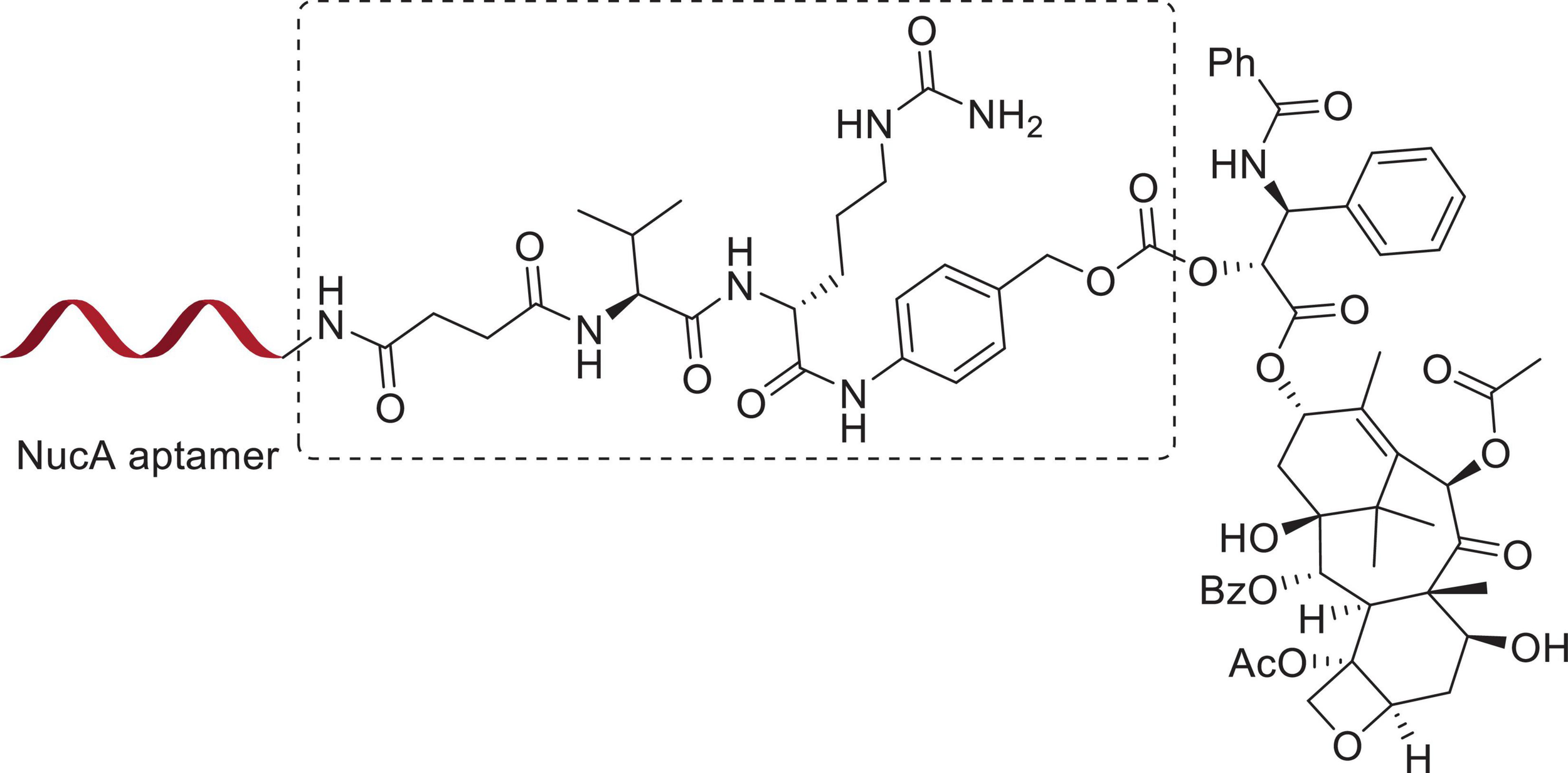 In 2017, Zhang’s group conjugated the nucleolar aptamer and PTX with a stable cathepsin B-sensitive dipeptide linker to form an aptamer–PTX conjugate with high aqueous solubility, prodrug transmittability, and tumor inhibition (shown in Figures 9, 10), which gathered target-specific binding affinity derived from the aptamer and cytotoxicity generated by PTX. These ApDCs adopted a stable enzyme-cleavable dipeptide linker that prevented the side effects generated by PTX through off-target effects from normal cells. Only when cancer cells were recognized by the aptamer part of ApDCs could this drug enter the cell by endocytosis, and then the linker could be degraded by cathepsin B, resulting in the release of payload to the target site. Through experiments, they found that ApDCs afforded higher therapeutic efficacy and prevented the growth of mouse xenografted tumors compared with free PTX or the free aptamer in vitro, which demonstrated the anticancer ability of ApDCs to perform robustly and accurately (Li F. et al., 2017). Correspondingly, AS1411 incorporated into PTX-harboring NPs has frequently been used for antitumor therapeutic exploitation. For instance, Luo and collaborators described that AS1411-modified poly(L-γ-glutamyl-glutamine) nanoconjugates encapsulating PTX (AS1411-PGG-PTX) significantly increased cellular uptake, apoptosis, and anti-proliferative activity in U87MG cells (a human glioblastoma cell line). These NPs significantly increased tumor accumulation and extended the median survival time in glioma-bearing mice (Luo Z. et al., 2017). In addition, AS1411-coated PTX-loaded NPs (Apt-PTX-PLGA NPs) gathered benefits against glial cancer cells, with little impact on normal mammary epithelial cells. Aravind and his collaborators found high cellular uptake after GI-1 cells (a human glial cancer cell line) were treated with Apt-PTX-PLGA NPs in contrast to uncoated NPs. Visible retention, internalization, and tumor accumulation were observed in vitro and in vivo (Aravind et al., 2012). Additionally, it was demonstrated that AS1411-endowed HSA NPs carrying PTX (Apt-NPs-PTX) exerted preferential penetration via nucleolin-mediated endocytosis, resulting in increased anti-proliferative activity against MCF-7 cells, contrary to MCF-10A cells (a normal human breast cell line), which were barely affected (Wu et al., 2013). The combination of PLK1-targeted siRNA and AS1411-modified liposomes co-harboring PTX caused improved tumor cell apoptosis and anti-angiogenic efficacy in vitro and in vivo (Yu et al., 2019).