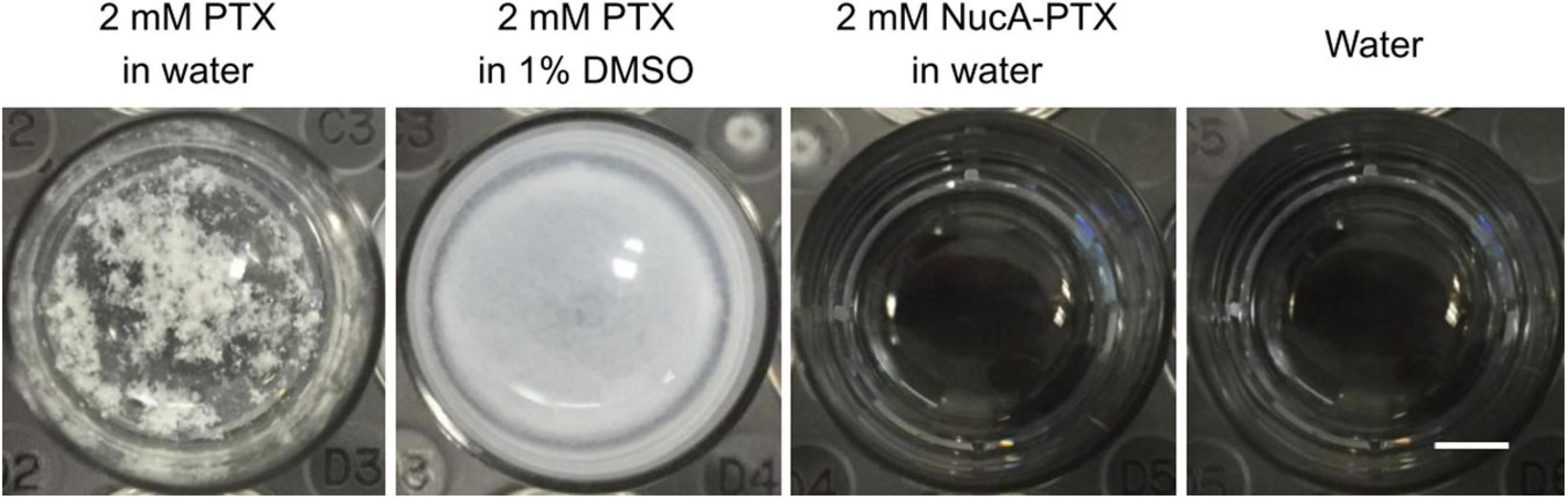 The aqueous solubility of free PTX and the NucA–PTX conjugate. The scale bar indicated is 3 mm. Copyright from Zhang et al. (Li F. et al., 2017).