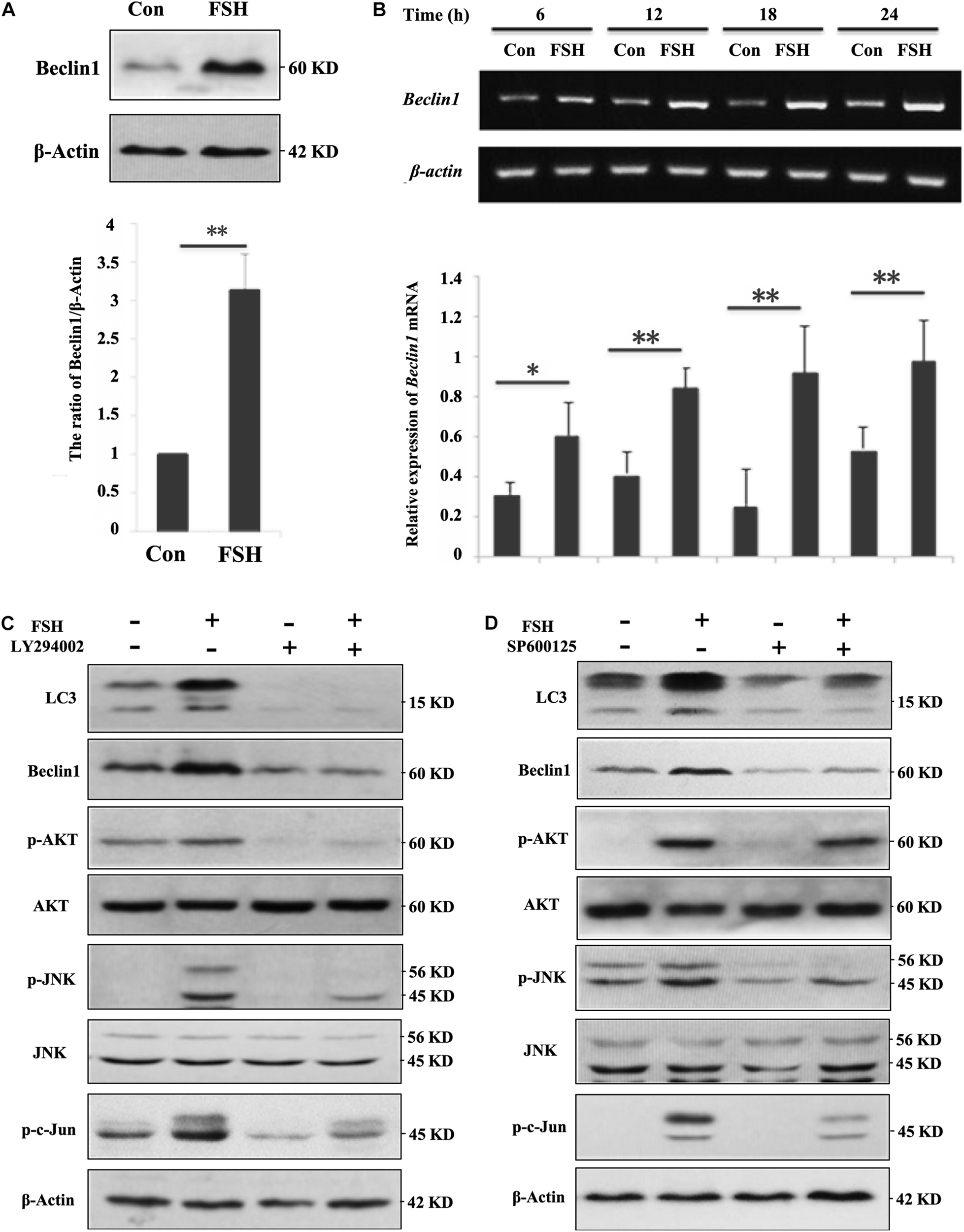 Figure 2. FSH upregulates beclin1 expression in porcine GC mass via the PI3K/JNK/c-Jun pathway. (A) GC mass were cultured in DMEM/F12 medium containing 0.01 IU/mL FSH for 24 h, beclin1 and β-actin levels were detected by western blotting of the whole cell lysates. (B) GC mass were cultured in DMEM/F12 medium containing 0.01 IU/mL FSH for the indicated hours, and total RNA was collected for cDNA synthesis. Expression of beclin1 and β-actin mRNA was measured by PCR assay. (C) GC mass were pre-treated with LY294002 (10 μM, inhibitor of PI3K/AKT signaling pathway) for 1 h before stimulation with 0.01 IU/mL FSH for 24 h, p-AKT, AKT, p-JNK, JNK, p-c-Jun, Beclin1, and β-actin levels were detected in whole cell lysates. (D) GC mass were pre-treated with SP600125 (10 μM, inhibitor of SAPK/JNK signaling pathway) for 1 h before stimulation with 0.01 IU/mL FSH for 24 h, p-AKT, AKT, p-JNK, JNK, p-c-Jun, Beclin1, and β-actin levels were detected in the whole cell lysates. ∗∗, P < 0.01, and ∗, P < 0.05 compared to the control group.