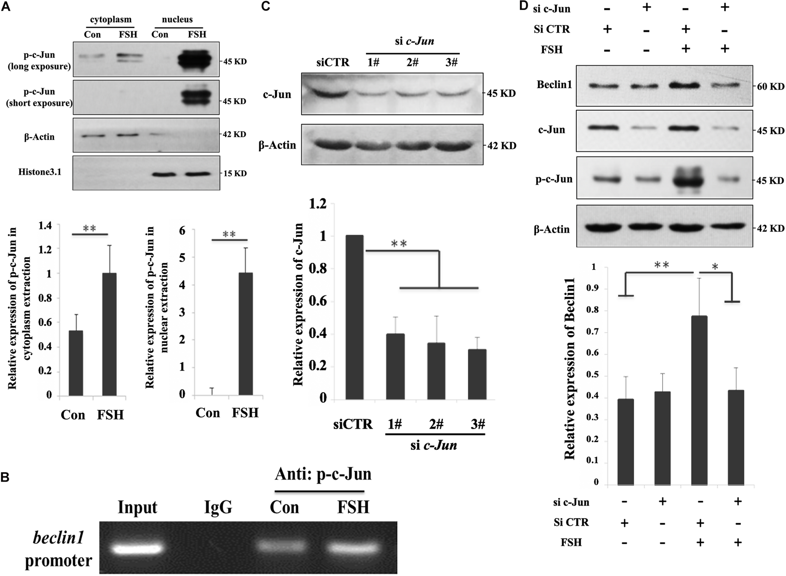 Figure 3. C-Jun was directly involved in beclin1 transcription in response to FSH treatment. (A) GC mass were cultured in DMEM/F12 medium containing 0.01 IU/mL FSH for 24 h, and nuclear and cytoplasmic fractions were prepared from granulosa cells and analyzed by western blotting using the indicated antibodies. Histone 3.1 and β-actin served as the fractionation and loading controls, respectively. ∗∗, P < 0.01 compared to the control group. (B) GC mass were cultured in DMEM/F12 medium containing 0.01 IU/mL FSH for 24 h, the cells were lysed, CHIP assays were performed, chromatin fragments were immunoprecipitated with antibodies against p-c-Jun antibody or normal rabbit IgG, and the beclin1 promoter was amplified by PCR. The graph of RT-PCR data represents the relative binding by p-c-Jun to the specified DNA-binding elements. (C) GC mass were transfected with c-Jun siRNAs (si c-Jun 1-3#) and control scramble siRNA (si-CTR) for 24 h and were then harvested and analyzed by immunoblotting with antibodies against c-Jun and actin. (D) GC mass were transfected with 3# c-Jun siRNA (si-c-Jun) and control scramble siRNA (si-CTR). At 20 h after transfection, the cells were treated with 0.01 IU/mL FSH for 24 h before harvesting. C-Jun, p-c-Jun, beclin1, and actin were detected in the whole cell lysates. ∗, p < 0.05; ∗∗, P < 0.01 compared to the control group.