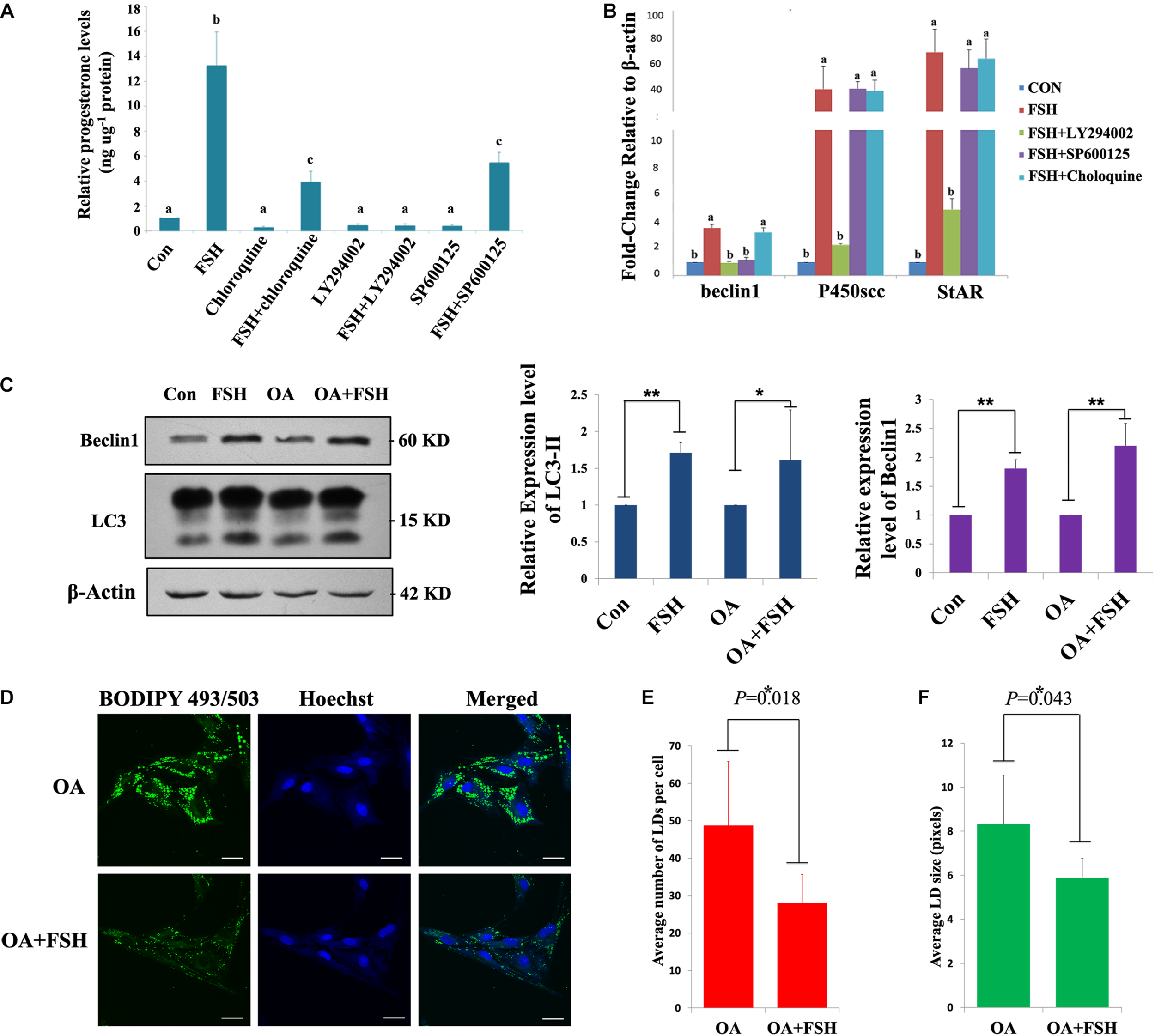Figure 4. Autophagy participates in progesterone production and lipid droplet metabolism upon FSH treatment in porcine GC mass. (A) Specific inhibitors of autophagy (chloroquine; 10 μM), PI3K/AKT (LY294002; 10 μM), and SAPK/JNK (SP600125; 10 μM) were added 1 h before treatment with 0.01 IU/mL FSH for 24 h in GC mass. The cells and culture medium were collected separately. The total proteins were extracted from the cells and quantified using the BCA method. The concentration of progesterone in the culture medium was analyzed using radioimmunoassay. The relative progesterone level in the culture medium was calculated as ng/μg protein. Different superscripts (a, b, c) indicate significant differences (P < 0.05) (B) Specific inhibitors of autophagy (chloroquine; 10 μM), PI3K/AKT (LY294002; 10 μM), and SAPK/JNK (SP600125; 10 μM) were added 1 h before treatment with 0.01 IU/ml FSH for 24 h in GC mass. Total RNA was extracted from the cells, reverse transcribed to cDNA, and analyzed by real-time PCR with primers against beclin1, StAR, and P450scc. (C) Adherent granulosa cells of the porcine ovary were cultured in DMEM/F12 serum-free medium with or without oleic acid (0.5 mM) for 12 h, and then cultured in DMEM/F12 serum-free medium with FSH (0.01 IU/mL) or with FSH and OA (0.5 mM) for 24 h. β-actin, LC3-II, and Beclin 1 levels were detected by western blotting. (D) BODIPY 493/503 LD staining of adherent granulosa cells after treatment with OA and FSH; Hoechst 33342 staining of the cell nuclei, Bars: 30 μm. (E) The average number of LDs per granulosa cell in the OA and OA + FSH groups. (F) The average size of LDs per granulosa cell in the OA and OA + FSH groups. Five visual regions were used for statistics. ∗, P < 0.05, ∗∗, P < 0.01.