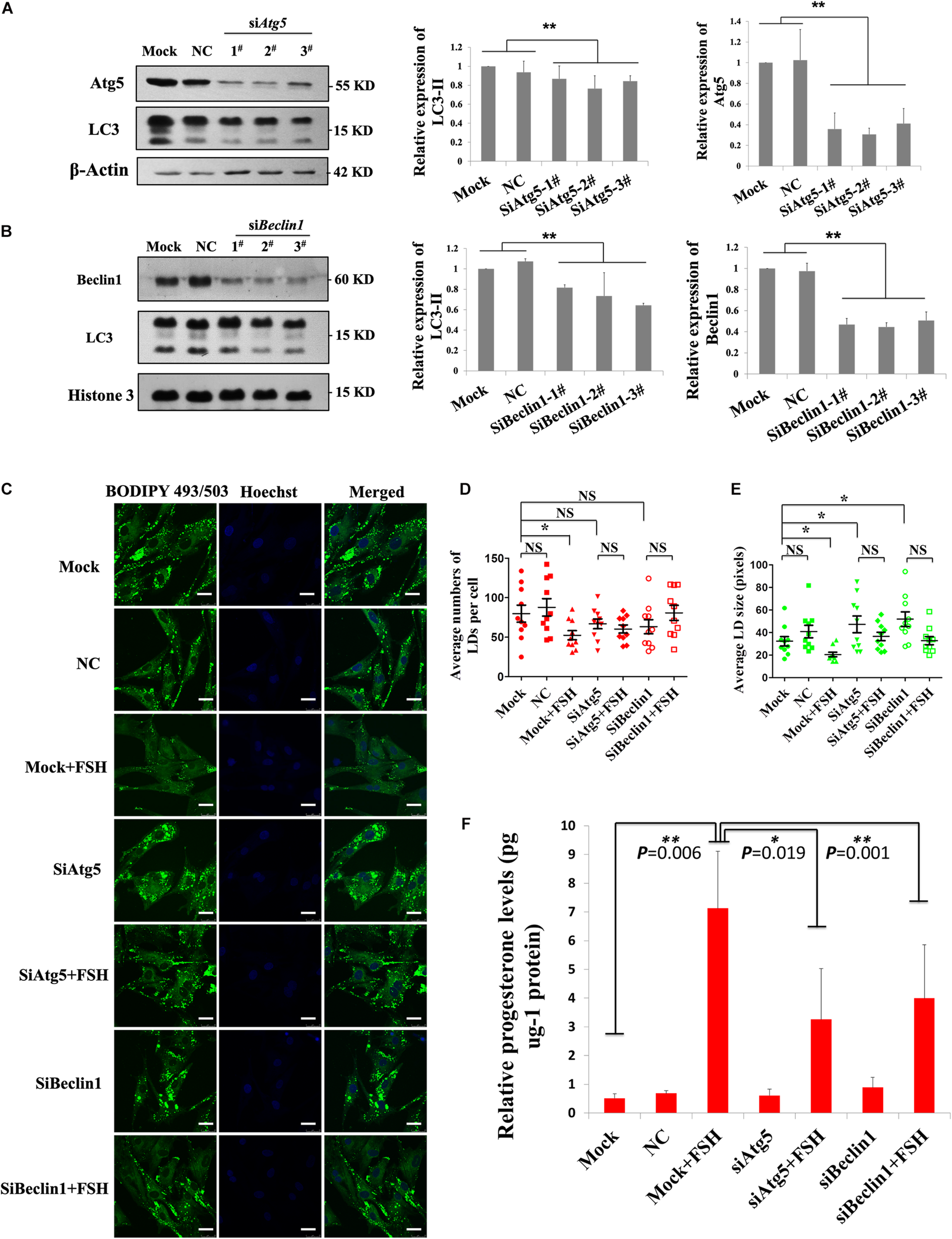 Figure 5. FSH degrades lipid droplets by enhancing autophagy to promote progesterone secretion in porcine follicle GCs. (A) Porcine adherent granulosa cells were transfected with Atg5 siRNAs (siAtg5 1-3#), NC siRNA, and blank control (Mock) for 24 h and then harvested and analyzed by immunoblotting with antibodies against Atg5, LC3, and actin. (B) Porcine adherent granulosa cells were transfected with Beclin1 siRNAs (siBeclin1 1-3#), NC siRNA, and blank control (Mock) for 24 h, harvested, and analyzed by immunoblotting with antibodies against Beclin1, LC3, and Histone 3. (C) BODIPY 493/503 LD staining of adherent granulosa cells, pre-treated with OA for 12 h, after treatment with NC siRNA, siAtg5 2#, and siBeclin1 3#, and then treated with FSH for 24 h; Hoechst 33342 staining of the cell nuclei, Bars: 25 μm. (D) The average number of LDs per granulosa cell in the Mock, NC, Mock + FSH, siAtg5, siAtg5 + FSH, siBeclin1, and siBeclin1 + FSH groups. (E) The average size of lipid droplets per granulosa cell in Mock, NC, Mock + FSH, siAtg5, siAtg5 + FSH, siBeclin1, and siBeclin1 + FSH groups. NC, negative control; NS, no significant. (F) The relative progesterone level in the culture medium from mock, NC, mock + FSH, siAtg5, siAtg5 + FSH, siBeclin1, and siBeclin1 + FSH groups was calculated as pg/μg protein. *, P < 0.05, **, P < 0.01.