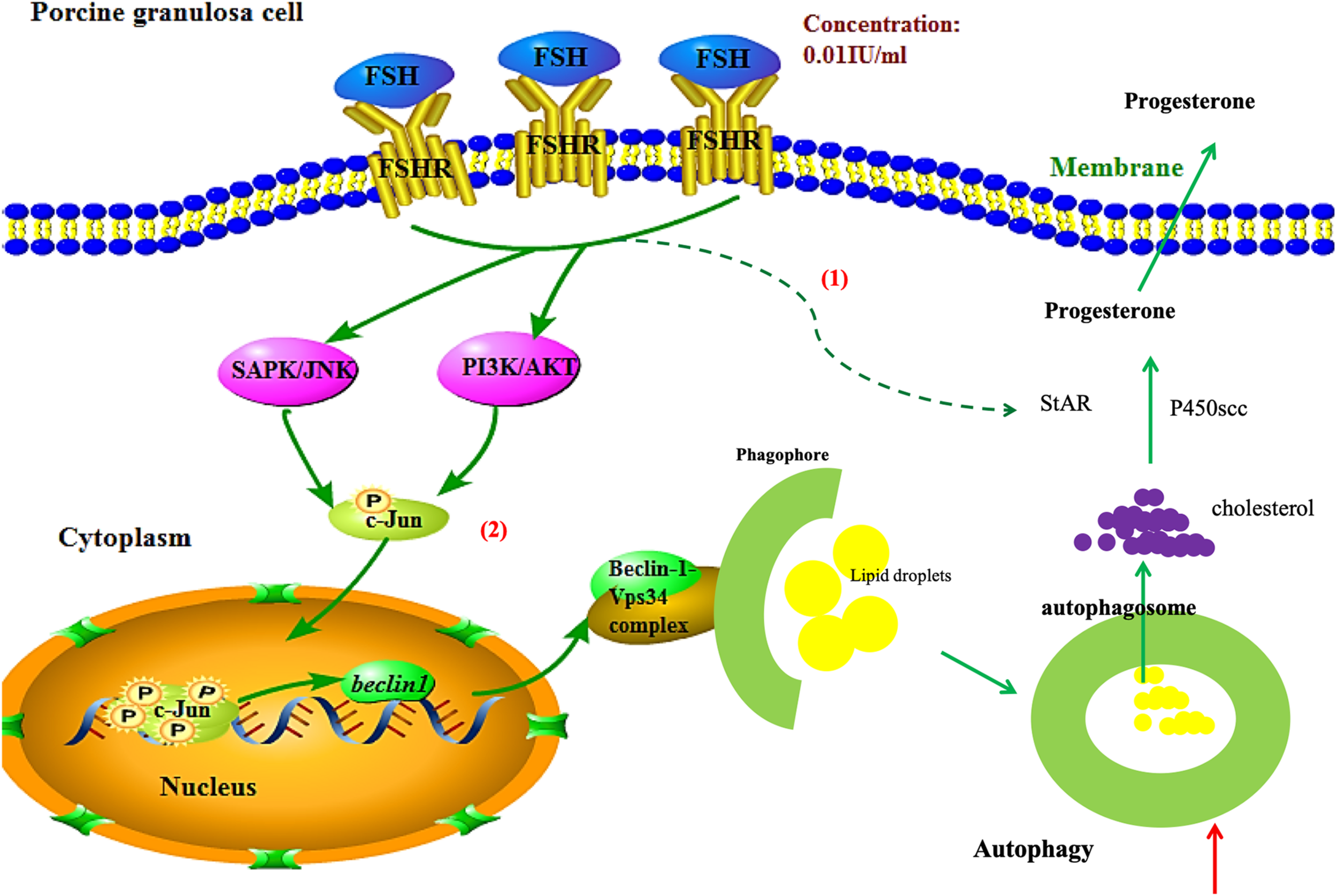 In summary, FSH promotes progesterone secretion by accentuating autophagy through upregulation of Beclin1 via the PI3K/JNK/c-Jun pathway to accelerate LD degradation and increase the expressions of steroidogenesis enzyme genes in porcine GCs (Figure 6). Our results provide new targets for ovarian hormone therapy and the manipulation of mammalian follicle development.