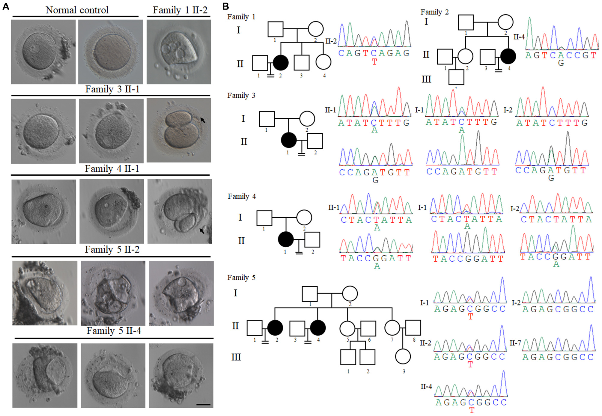 The first patient (family 1 II-2) had not conceived after 3 years of attempts without contraception, and she was diagnosed with primary infertility at the age of 25. She had regular menstrual cycles and normal sex hormone concentrations (Table 1). She underwent three in vitro fertilization (IVF) attempts. A total of 33 oocytes were retrieved, of which 17 GV oocytes were retrieved and the remaining 16 oocytes degenerated (Figure 1A and Table 1). The second patient (family 2 II-4) was 28 years old and had been diagnosed with infertility 3 years earlier. In her first IVF treatment attempt, four MI oocytes and one matured Pb1 oocyte were retrieved. Only one degenerated oocyte was retrieved in her second IVF treatment cycle (Table 1). The third patient (family 3 II-1) was 28 years old and had been diagnosed with primary infertility of unknown causes for 7 years. Thirty oocytes were retrieved in two IVF cycles, including 17 GV oocytes, five MI oocytes, four degenerated oocytes, three Pb1 oocyte with abnormal morphology, and one fertilized oocyte but arrested at early stage (Figure 1A and Table 1). The forth patient (family 4 II-1) was 32 years old and during her 4 years of infertility, she underwent one IVF cycle. She had a similar phenotype that two Pb1 oocytes with large polar body were retrieved apart from four immature GV oocytes (Figure 1A and Table 1). Two sisters from family 5 (family 5 II-2 and II-4) had been diagnosed with primary infertility for several years, although they all had regular menstrual cycles and normal sex hormone concentrations. They had same phenotypes in their IVF treatments, such that all immature oocytes were arrested at GV stage (Figure 1A and Table 1).