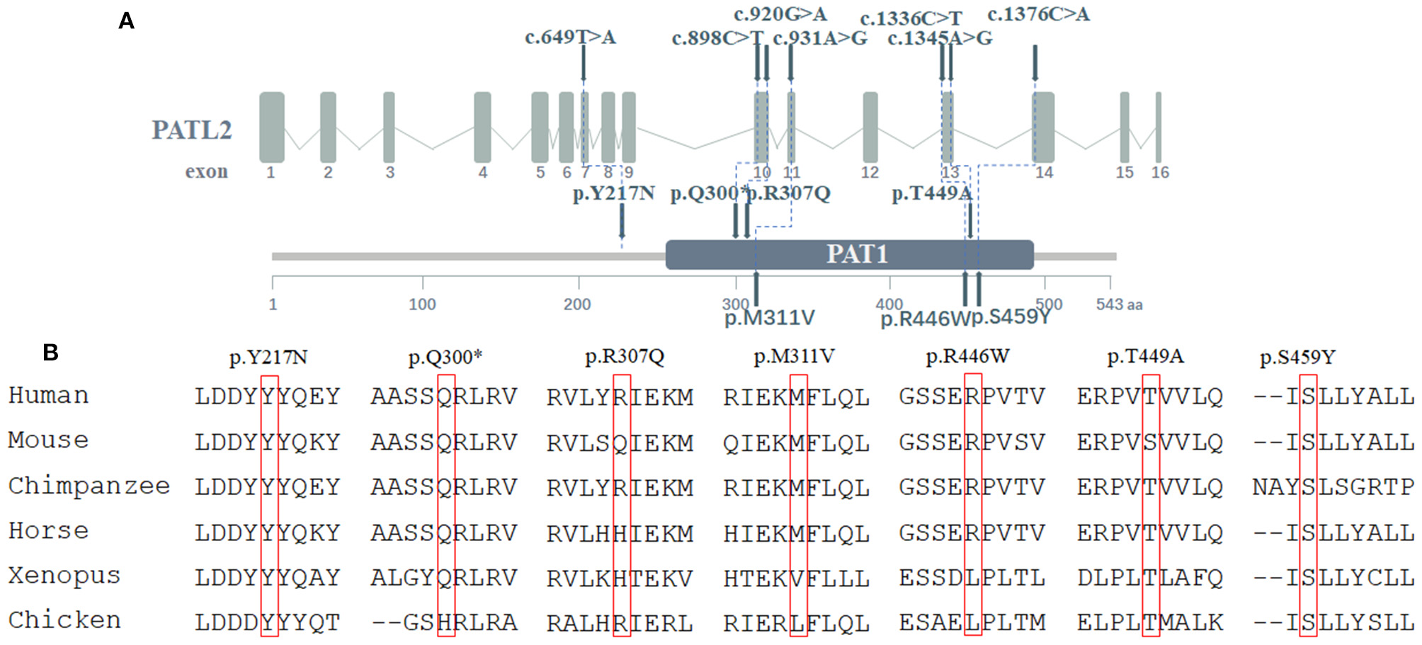 Location and conservation of mutations in PATL2. (A) The positions of PATL2 mutations and functional domains are indicated in the gene structures. (B) Conservation of mutated sites in PATL2 among species.