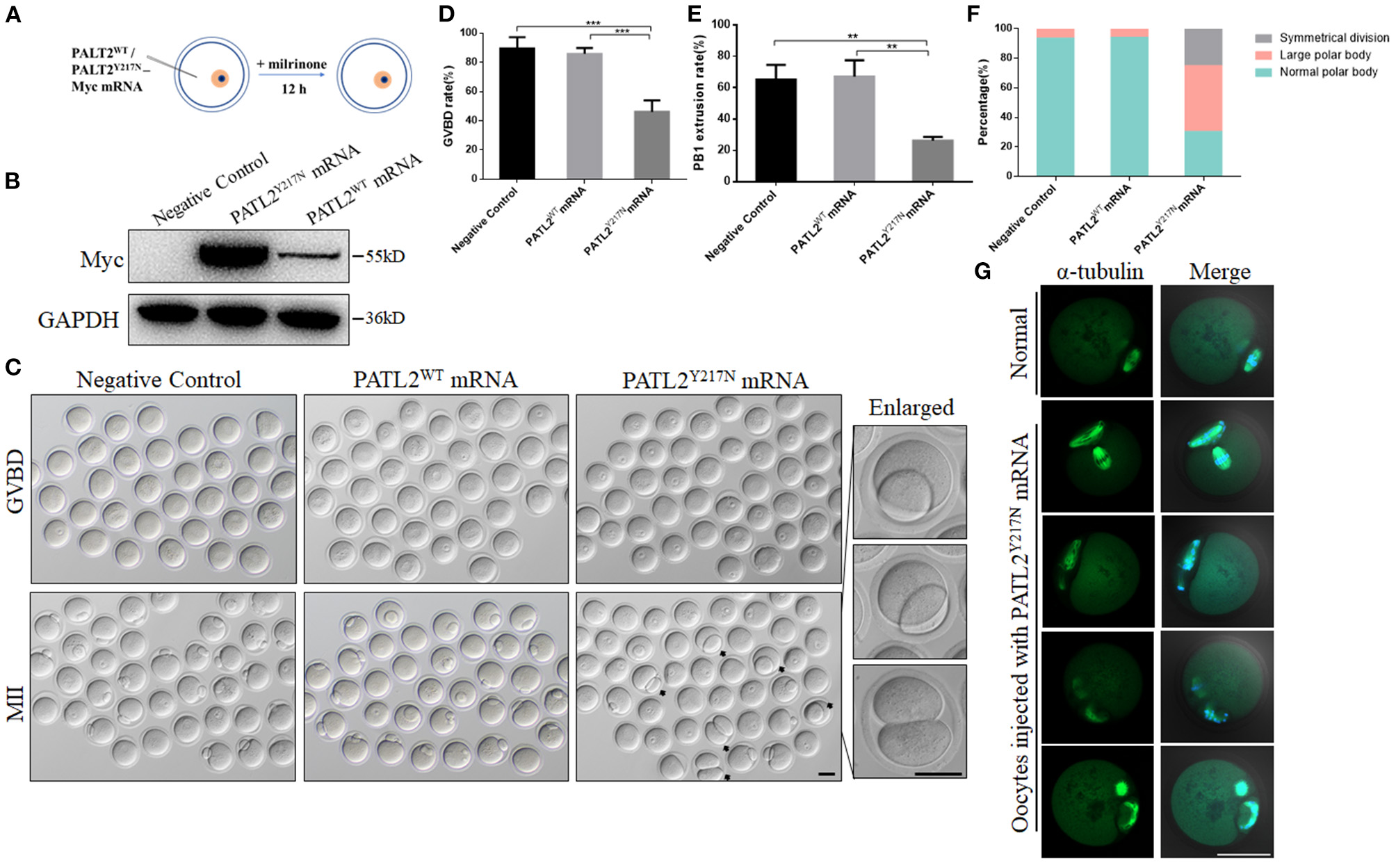 Pathogenicity of Y217N variant in mouse oocyte. (A) Illustration of mRNA microinjection in (B–G). (B) Expression of PATL2WT and PATL2Y217N cRNA after microinjection was verified by Western blot analysis. (C) Phase-contrast images of negative control and PATL2WT or PATL2Y217N cRNA injected oocytes. Black arrows indicate oocytes with apparent abnormal polar body. Enlarged images of oocytes with large polar body and symmetrical division are arranged in the right line. Scale bars indicate 50 μm. (D,E) Quantitative analysis of GVBD rate (D) and Pb1 extrusion rate (E) Graphs show means ± SD of results observed in three independent experiments. **P < 0.01, ***p < 0.001 (F) The proportion of the normal polar body, large polar body and symmetrical division in negative control and PATL2WT or PATL2Y217N cRNA injected oocytes. Total number of oocytes analyzed: n = 184 for negative control oocytes; n = 200 for PATL2WT cRNA injected oocytes; n = 74 for PATL2Y217N cRNA injected oocytes. P < 0.017 was considered to be statistically significant by Pearson chi square test. (G) Spindle defects and chromosome misalignment were detected in PATL2Y217N cRNA injected oocytes. Scale bar indicates 50 μm.