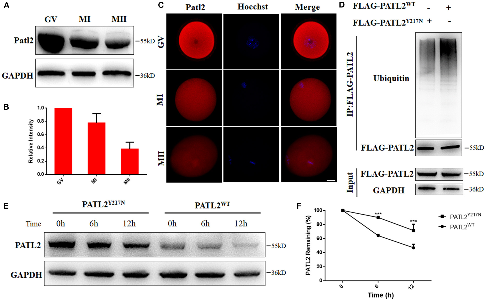 Effects of Y217N variants on PATL2 degradation. (A,B) The Patl2 levels in oocytes at germinal vesicle (GV), meiosis metaphase I (MI), and meiosis metaphase II (MII) stages were determined by western blot. (C) Immunostaining of Patl2 in oocytes at GV, MI, and MII stages. Scale bar, 20 μm. (D) Ubiquitination was evaluated by co-IP with an anti-FLAG antibody. (E,F) The PATL2 stability comparison between group of PATL2WT or PATL2Y217N transfected cells is followed by CHX treatment. ***p < 0.001.