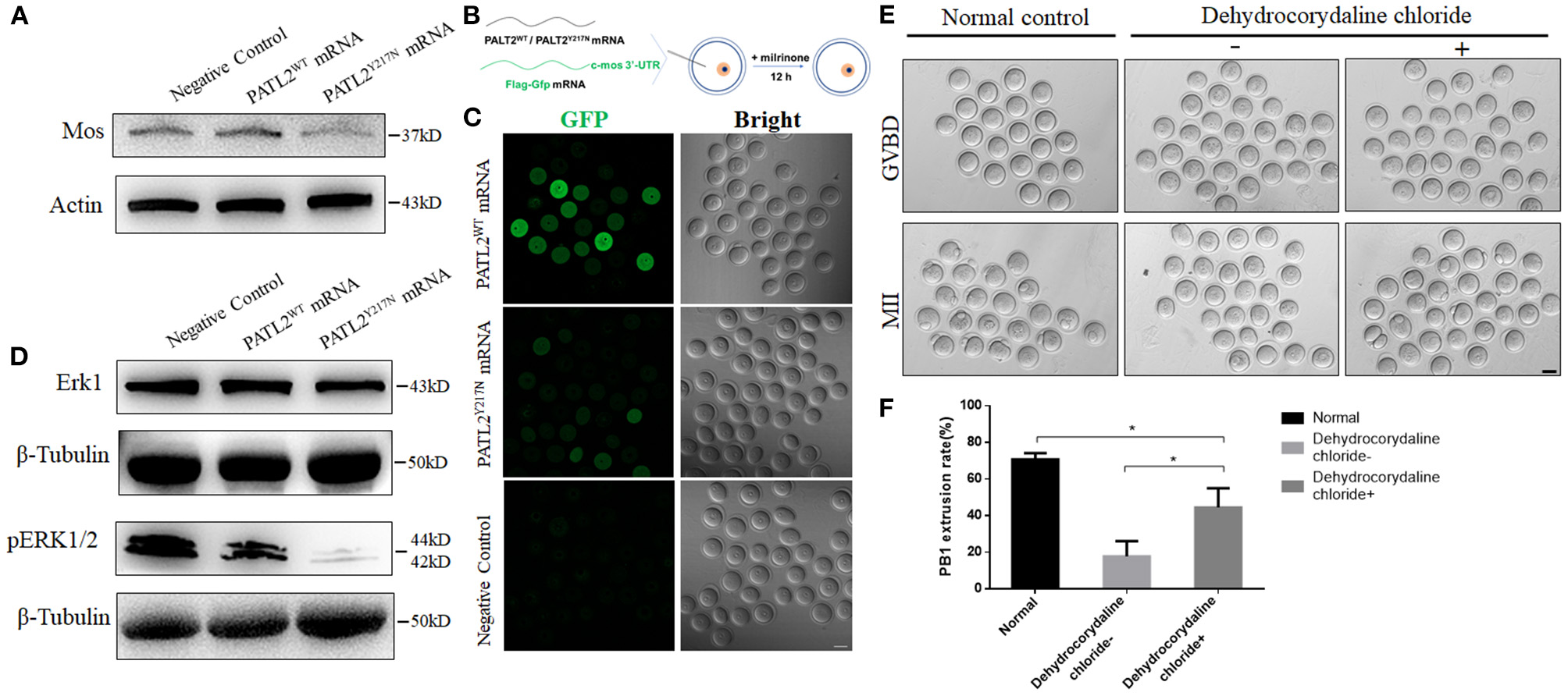 Repression of MOS with its cascade effect and phenotypic rescue by dehydrocorydaline chloride. (A) The MOS level in oocyte groups of negative control, PATL2WT or PATL2Y217N cRNA microinjected were determined by western blot. (B) Illustration of mRNA microinjection and oocyte culture. (C) Fluorescence results showing the expression of GFP fused with Mos 3′-UTR. The scale bar represents 50 μm. (D) ERK1and pERK1/2 protein levels in in oocytes of negative control, PATL2WT or PATL2Y217N cRNA microinjected were determined by western blot. (E) Representative images of normal control oocytes and that of PATL2Y217N cRNA injected oocytes were cultured with/without dehydrocorydaline chloride. Scale bars indicate 50 μm. (F) Quantitative analysis of Pb1 extrusion rate. Data are represented as the mean ± SD; *p < 0.05.