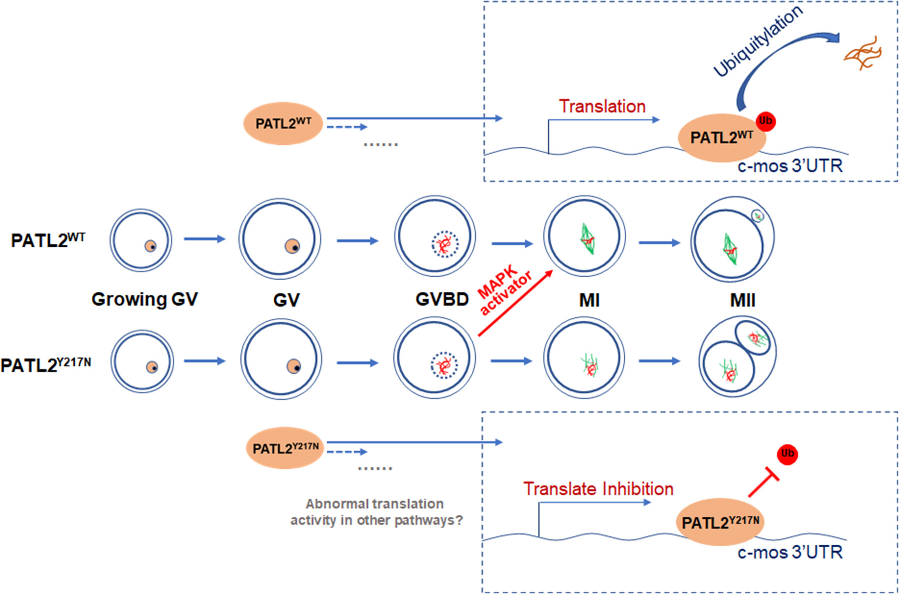 A schematic representation of the proposed mechanism by which Y217N mutation in PATL2 impairs oocyte meiotic process. The mutation p.Y217N in PATL2 decreased its ubiquitination level and led to its abnormal accumulation. Then, increased PATL2 repressed translational activity of Mos and impaired oocyte meiotic maturation. Addition of the activator of subsequent MAPK signaling partially rescued the impairment of meiotic maturation in PATL2 mutated oocytes. Further, it was speculated that some other mechanisms still remained in defect oocyte maturation influenced by PATL2 mutation.