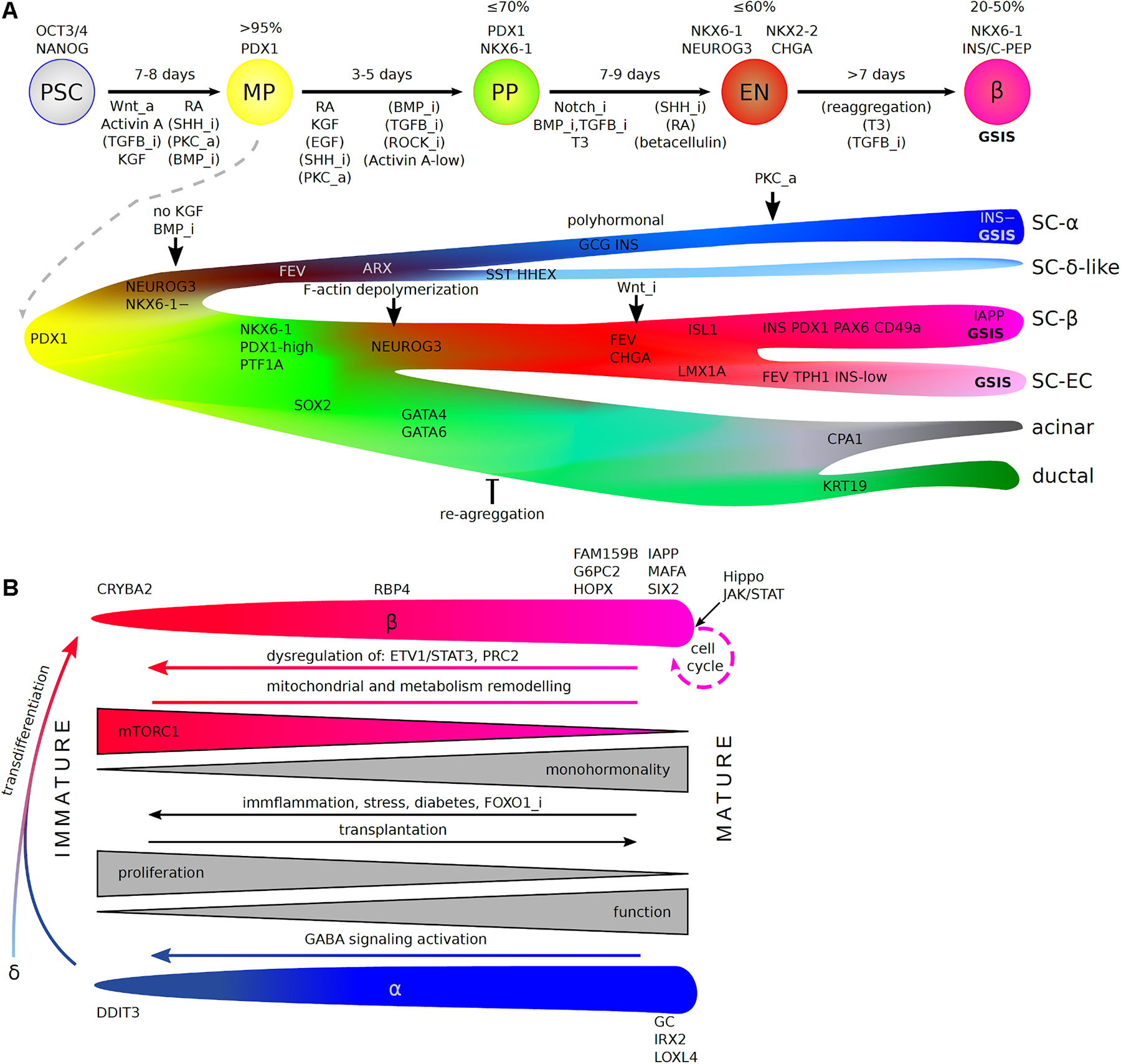 Figure 2. scRNA-Seq insight into in vitro hPSC differentiation toward human pancreatic β-cells (A) and endocrine cell maturation (B). (A) (Top) Stages of differentiation protocols (arrows), which recapitulate consecutive pancreas development steps in vivo (circles). Denoted are: a length of each stage (above arrows, in days), genes commonly used to estimate differentiation efficiency (% + for stage markers out of all cells), and pathways that are inhibited (“_i”) or activated (“_a”) during each stage (below arrows). Pathways without brackets are essential for the process and applied in all commonly used protocols, while brackets indicate pathways regulated in a fraction of protocols. PSC—pluripotent stem cells, MP—multipotent progenitors, BP—bipotent progenitors, EN—endocrine lineage (endocrine progenitors and immature endocrine cells), β—β-cells, GSIS—glucose stimulated insulin secretion. (Bottom) A detailed view on the differentiation based on scRNA-Seq reveals the origin of non-β-cell specific populations that deteriorate differentiation efficiency and points to branching at which the protocols could be refined. Factors identified in scRNA-Seq studies that improve specific lineage choices are denoted. SC—stem cell-derived, EC—enterochromaffin cells. (B) Maturation of β- and α- cells including molecular changes and marker genes along the process. Dedifferentiation (reverse arrows), transdifferentation, and re-entering cell cycle are possible as physiological compensatory mechanisms, in pathology and when artificially forced by identified factors, with potential use in medicine.
