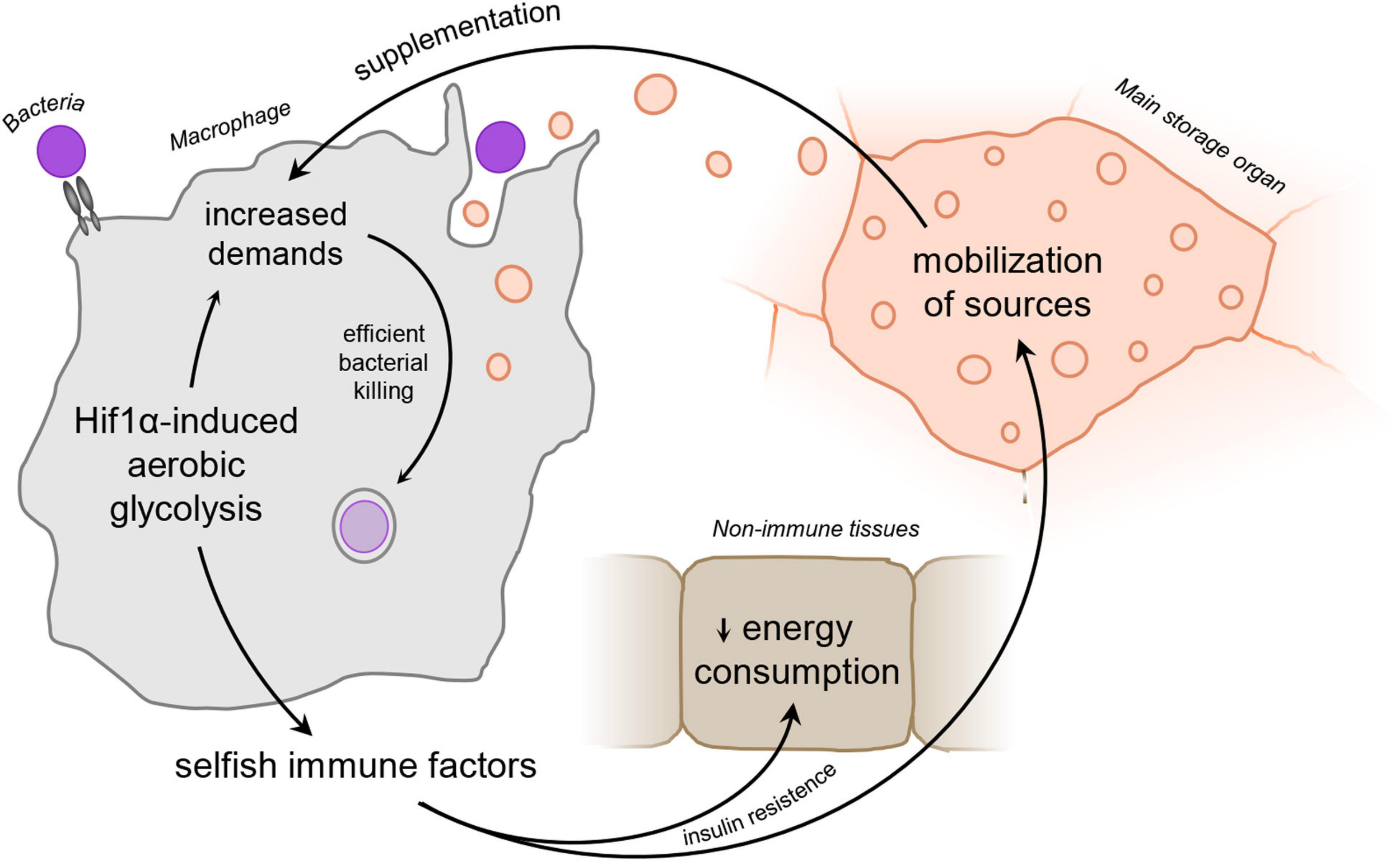 Figure 1. Schematic representation of the “selfish immune system theory.” Infection-activated macrophages adopt Hif1α-induced aerobic glycolysis and subsequently release signaling factors to ensure sufficient amount of nutrients to supplement the immune function. Hif1α, hypoxia-inducible factor 1 α.