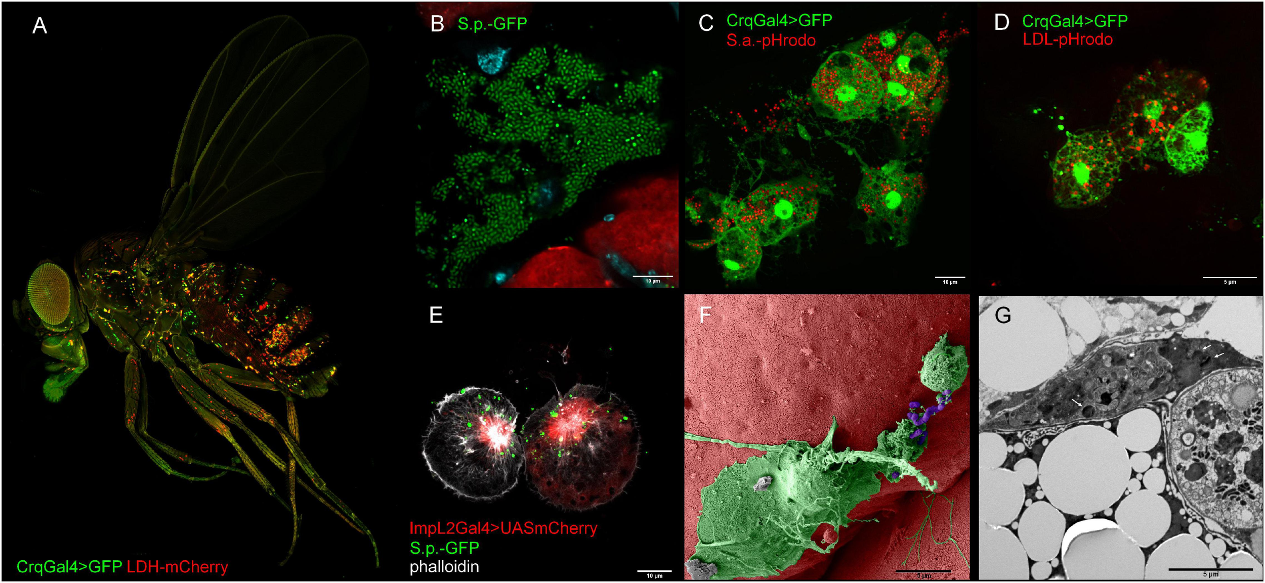 Figure 2. Representative confocal and electron microscopy images of Drosophila macropahges. (A) Adult Drosophila bearing a genetic construct that enables visualization of macrophages (in green HmlGal4 > UAS2xeGFP) and tissue expressing lactate dehydrogenase (LDH-mCherry). (B) Confocal image depicting growth of streptococcus in dissected Drosophila abdomen (green—S. pneumoniae, red pericardial cells, cyan—DAPI). (C) Confocal image depicting phagocytic events by injection of Drosophila adult with pHrodoTM Red S. aureus BioparticlesTM Conjugate. Macrophages are visualized by endogenously expressed GFP (Crq > GFP) (green—macrophages, red—phagolysosomes). (D) Confocal image depicting endocytosis of low-density lipoproteins by injection of adult fly with pHrodoTM Red-LDL. Macrophages are visualized by endogenously expressed GFP (Crq > GFP) (green—macrophages, red—LDL-containing late endosomes). (E) ImpL2-expressing macrophages interacting with fluorescently labeled S. pneumoniae (green—S. pneumoniae, red—ImpL2 Gal4 > UAS mCherry, white—phalloidin). (F) Pseudo-colored scanning electron micrograph of a macrophage interacting with S. pneumoniae (green—macrophage, purple—S. pneumoniae). (G) Transmission electron micrograph of S. pneumoniae bacteria (white arrows) in a macrophage. Crq, croquemort; ImpL2, imaginal morphogenesis protein late 2; LDL, low-density lipoproteins; S.p., Streptococcus pneumoniae.