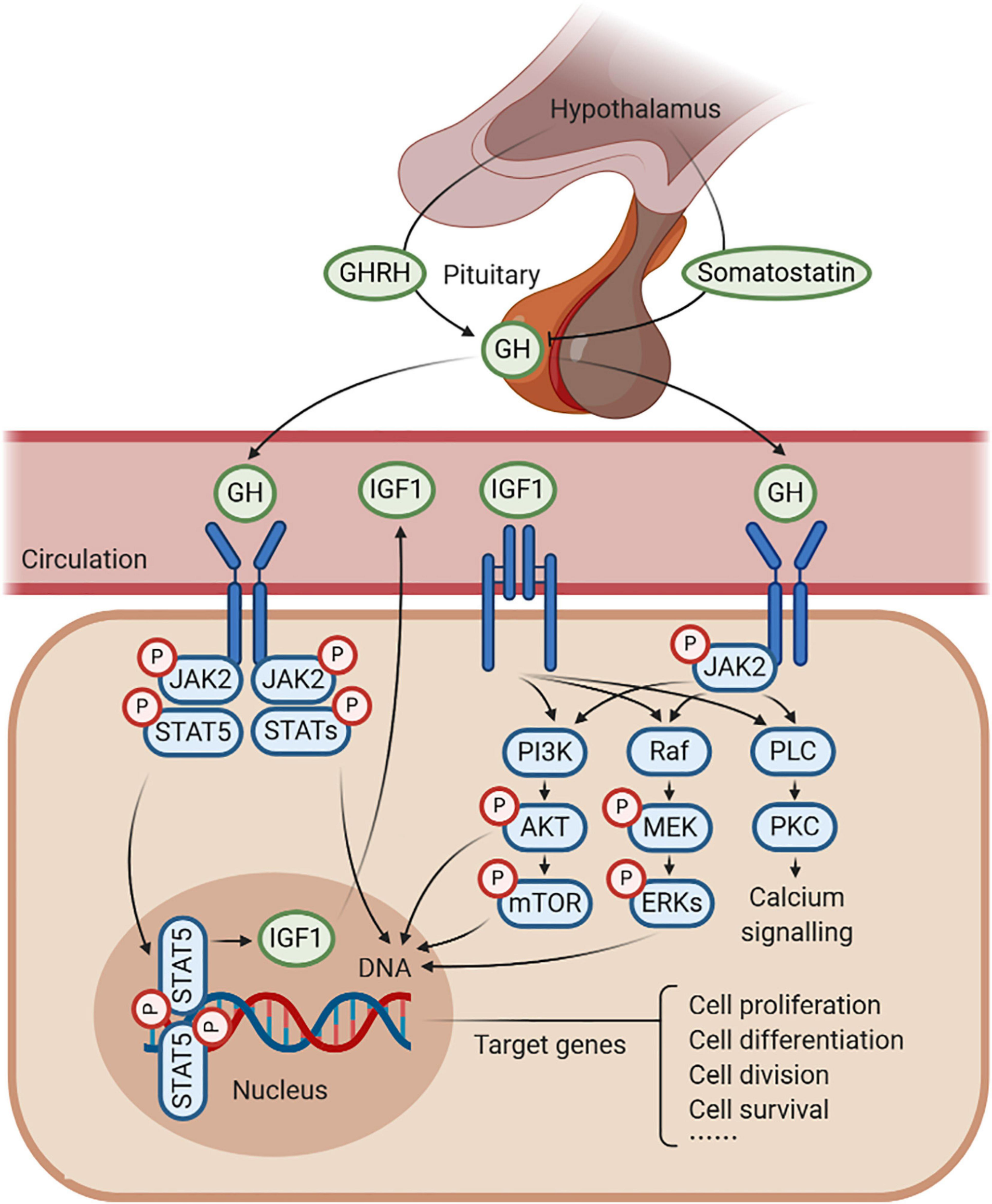 Figure 1. Schematic representation of growth hormone (GH)–GH receptor (GHR)–insulin-like growth factor 1 (IGF1) axis. GH is produced by the pituitary gland, which is under the positive control of the GH-releasing hormone (GHRH) and the negative feedback of somatostatin. GH combines with GHR to regulate the production of IGF1, in response to somatic growth, including cell proliferation, cell differentiation, cell division, and cell survival. In this process, several signaling pathways are activated, such as JAK2/STAT5, MAPK, and PI3K/AKT signaling under an anabolic state (such as during periods of feeding), as well as PLC/PKC signaling under a catabolic state (such as during periods of fasting).