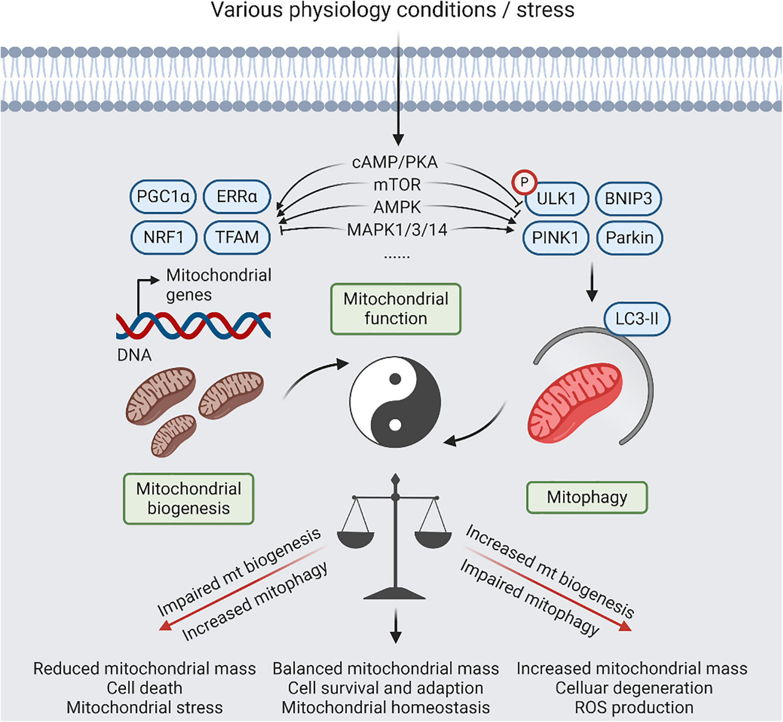 Figure 2. A balanced act of mitophagy and mitochondrial biogenesis. Coordination between mitochondrial (mt) biogenesis and mitophagy results in generation of new synthesized mitochondria, and elimination of detrimental and/or superfluous mitochondria, which is controlled by several signaling pathways, including cyclic-AMP (cAMP)/protein kinase A (PKA), AMP-activated protein kinase (AMPK), mitogen-activated protein kinase (MAPK), and mammalian target of rapamycin (mTOR) signaling, in response to physiological adaptations and stress conditions. Relative to normal condition, increased mitophagy or impaired mt biogenesis will lead to reduced mitochondria mass, contributing to cell death that be dependent on mitochondrial function. Reversely, impaired mitophagy or increased mt biogenesis will lead to imbalanced responses, resulting in increased mitochondria mass, increased reactive oxygen species (ROS) production, and cellular degeneration. However, restoration of mitochondrial homeostasis with increased mitochondrial damage will require simultaneous upregulation of mitophagy and mitochondrial biogenesis.