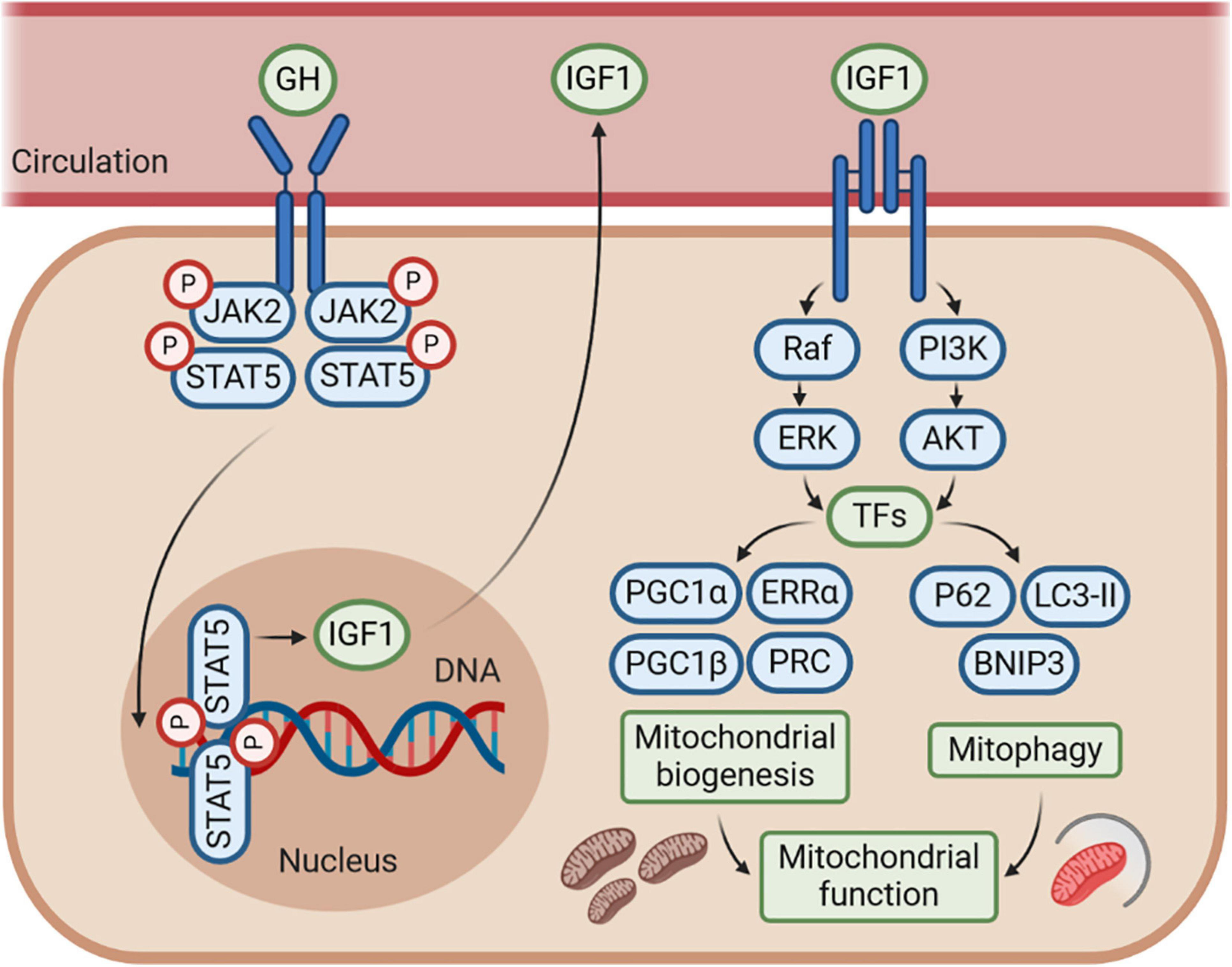 Figure 3. The GH–GHR–IGF1 axis may control mitochondrial function by regulating mitochondrial biogenesis and mitophagy. The effects of GH–GHR–IGF1 axis on mitochondrial function may be mostly mediated by IGF1, which stimulates several signaling pathways, including phosphoinositide-3-kinase (PI3K)/AKT and Ras/Raf/MAPK signaling, to further activate numerous transcription factors (TFs). This cascade leads to transcriptional activity of genes involved in both mitochondrial biogenesis and mitophagy. Accordingly, IGF1 is commonly considered to enhance mitochondrial function by promoting mitochondrial biogenesis and mitophagy under several conditions of metabolic or mitochondrial stress. However, whether there is an interaction between the mitochondrial biogenesis and mitophagy regulated by IGF1 is still unknown, and further research is needed.