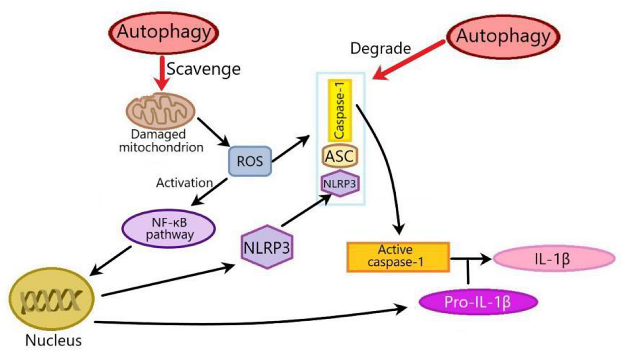 Two mechanisms of the effects of autophagy on NLRP3 inflammasome in metabolic disorders. There are two mechanisms of the effects of autophagy on NLRP3 inflammasome: one is that autophagy inhibits NLRP3 inflammasome by scavenging ROS from damaged mitochondria. Mitochondria-derived ROS can activate NF-κβ pathway to promote the transcription of NLRP3 and pro-IL-1β, thus activating NLRP3 inflammasome. The other is that autophagy inhibits NLRP3 inflammasome through degrading inflammasome components such as pro-IL-1β, NLRP3, caspase-1, or ASC. ROS, Reactive oxygen species; NF-κβ, nuclear factor kappa-B; ASC, apoptosis-associated speck-like protein.