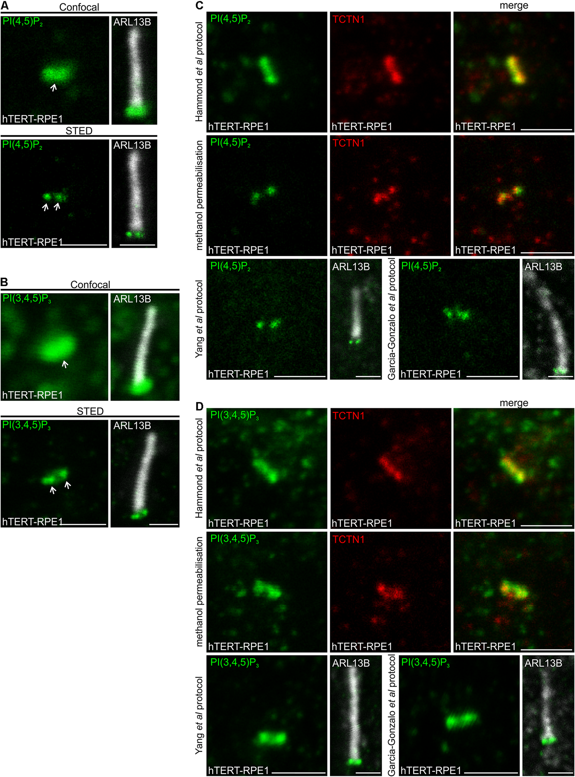 PI(4,5)P2 and PI(3,4,5)P3 localize to the transition zone in ciliated hTERT-RPE1 cells. (A,B) Ciliated hTERT-RPE1 cells were immunostained with (A) PI(4,5)P2 or (B) PI(3,4,5)P3 (green) and ARL13B (grayscale) antibodies and imaged by confocal and STED microscopy. Right panels show merged image at lower magnification. Arrows indicate transition zone PI(4,5)P2 signals, bar indicates 1 μm. (C,D) Ciliated hTERT-RPE1 cells were immunostained with (C) PI(4,5)P2 (green) or (D) PI(3,4,5)P3 (green) and TCTN1 (red) or ARL13B (grayscale) antibodies using the Hammond et al. (2009) Golgi protocol, the methanol permeabilization protocol, the Yang et al. (2015) or Garcia-Gonzalo et al. (2011) protocol and imaged by confocal microscopy, bar indicates 1 μm.