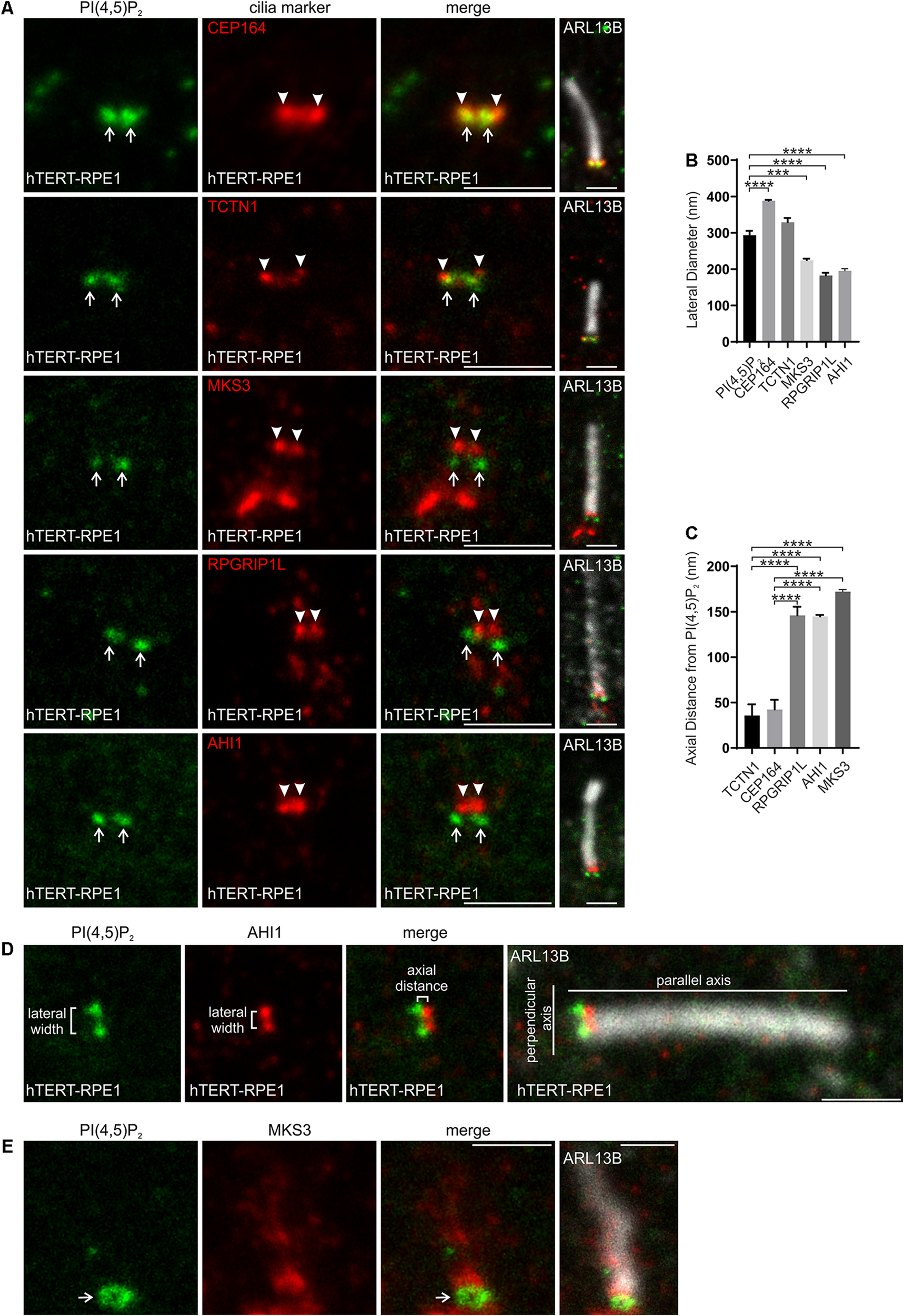 Image analysis was performed using Image J software. For lateral diameter and axial distance measurements, the parallel axis was defined using the ARL13B stained axoneme signal and the perpendicular axis defined as 90° to the parallel axis (Figures 3E, 4E). Lateral diameter measurements were performed for PI(3,4,5)P3, PI(4,5)P2, pAKT(S473), INPP5E, transition zone proteins and CEP164 from all images exhibiting two distinct signal intensity peaks. The lateral diameter was the distance in the perpendicular plane between the highest intensity point of each signal intensity peak. The axial distance was measured in all images with distinct PI(3,4,5)P3 or PI(4,5)P2, pAKT(S473) and transition zone protein or CEP164 signals. The axial distance was the distance in the parallel plane between the highest intensity points of the PI and the transition zone protein signals.