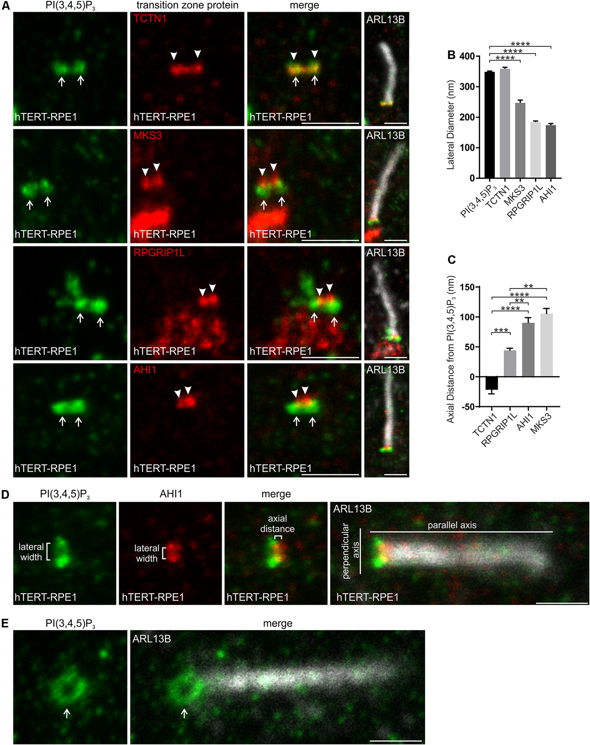 PI(3,4,5)P3 localizes to a specific subdomain of the transition zone. (A) Ciliated hTERT-RPE1 cells were immunostained with PI(3,4,5)P3 (green), ARL13B (grayscale) and TCTN1, MKS3, RPGRIP1L or AHI1 (red) antibodies and imaged by STED microscopy (confocal resolution image of the ARL13B stained axoneme is shown). Right panels show merged image at lower magnification. Arrows indicate transition zone PI(3,4,5)P3 signal, arrow heads indicate transition zone protein localization, bar indicates 1 μm. (B) Graph shows the lateral diameter between the highest intensity points of the PI(3,4,5)P3 or transition zone protein puncta perpendicular to the plane of the axoneme. Bars represent mean ± SEM, n = 3 independent experiments, 30 cilia imaged per experiment and all cilia with two distinct PI(3,4,5)P3 or transition zone protein puncta measured, statistical significance was determined using one-way ANOVA (p < 0.0001) followed by Tukey’s post hoc test, ****p < 0.0001. (C) Graph shows the axial distance between the highest intensity point of the PI(3,4,5)P3 signal and each transition zone protein signal parallel to the plane of the axoneme. Bars represent mean ± SEM, n = 3 independent experiments, 30 cilia imaged per experiment and all cilia with distinct PI(3,4,5)P3 or transition zone protein puncta measured, statistical significance was determined using one-way ANOVA (p < 0.0001) followed by Tukey’s post hoc test, **p < 0.01, ***p < 0.001, ****p < 0.0001. (D) Representative image showing the method used for the lateral diameter and axial distance measurements, bar indicates 1 μm. (E) Ciliated hTERT-RPE1 cells were immunostained with PI(3,4,5)P3 (green) and ARL13B (grayscale) antibodies and imaged by STED microscopy (confocal resolution image of the ARL13B stained axoneme is shown). Arrow indicates ring shaped transition zone PI(3,4,5)P2 morphology, bar indicates 1 μm.