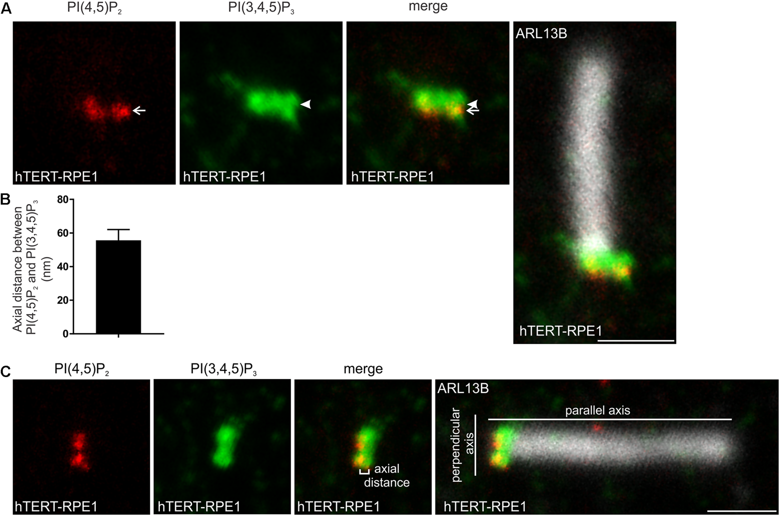PI(4,5)P2 and PI(3,4,5)P3 localize to distinct subdomains within the transition zone. (A) Ciliated hTERT-RPE1 cells were immunostained with PI(4,5)P2 (red), PI(3,4,5)P3 (green) and ARL13B (grayscale) antibodies and imaged by STED microscopy (confocal resolution image of the ARL13B stained axoneme is shown). Arrow indicates PI(4,5)P2 transition zone signal and arrow head indicates PI(3,4,5)P3 transition zone signal, bar indicates 1 μm. (B) Graph shows the axial distance between the highest intensity point of the PI(4,5)P2 and PI(3,4,5)P3 signals parallel to the plane of the axoneme. Bars represent mean ± SEM, n = 3 independent experiments, 30 cilia imaged per experiment and all cilia with distinct PI(4,5)P2 and PI(3,4,5)P3 puncta measured. (C) Example image showing method for the axial distance measurements, bar indicates 1 μm.