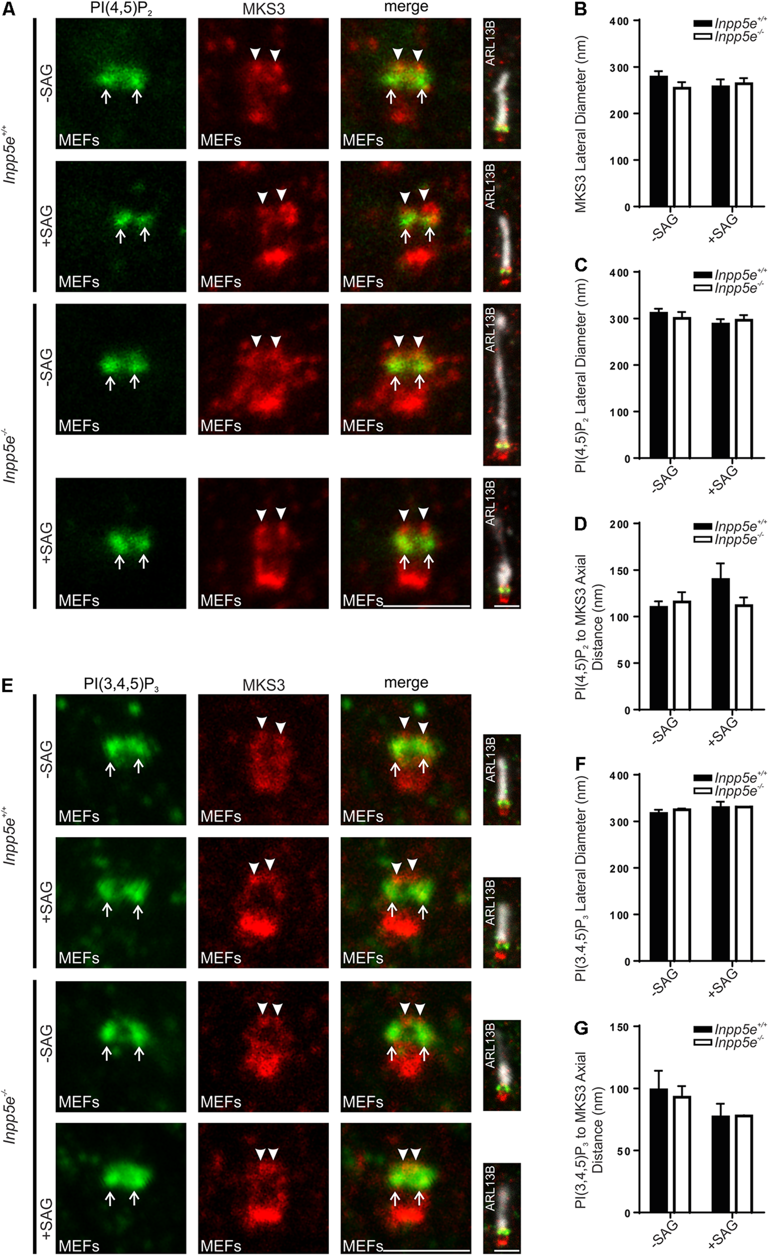 Transition zone phosphoinositide subdomain localization is not altered by stimulation or loss of a regulatory 5-phosphatase, INPP5E. (A–G) Ciliated Inpp5e+ / + and Inpp5e–/– MEFs cells were treated + /- 100 nM SAG and immunostained with (A) PI(4,5)P2 or (E) PI(3,4,5)P3 (green), MKS3 (red) and ARL13B (grayscale) antibodies and imaged by STED microscopy (confocal resolution image of the ARL13B stained axoneme is shown). Right panels show merged image at lower magnification. Arrows indicate transition zone PI signals, arrow heads indicate MSK3 localization, bar indicates 1 μm. Graph shows the lateral diameter between the highest intensity points of the (B) MKS3, (C) PI(4,5)P2 or (F) PI(3,4,5)P3 puncta perpendicular to the plane of the axoneme. Bars represent mean ± SEM, n = 3 independent experiments, 30 cilia imaged per experiment and all cilia with two distinct PI or transition zone protein puncta measured. Graph shows the axial distance between the highest intensity point of the (D) PI(4,5)P2 or (G) PI(3,4,5)P3 signal and the MKS3 signal parallel to the plane of the axoneme. Bars represent mean ± SEM, n = 3 (n = 2 for SAG treated Inpp5e–/– cells) independent experiments, 30 cilia imaged per experiment and all cilia with distinct PI or MKS3 puncta measured.