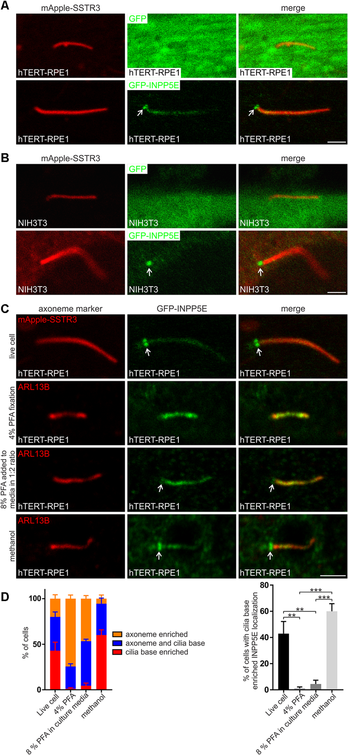 INPP5E localizes to the transition zone. (A) hTERT-RPE1 or (B) NIH3T3 cells were transfected with mApple-SSTR3 and GFP or GFP-INPP5E, serum starved and imaged live by confocal microscopy. Arrow indicates transition zone INPP5E localization, bar indicates 2 μm. (C) hTERT-RPE1 cells were transfected with GFP-INPP5E ± mApple-SSTR3, serum starved and imaged live or immunostained with GFP (green) and ARL13B (red) antibodies using 4% PFA, 8% PFA added directly to the culture media in a 1:2 ratio or –20°C methanol fixation and imaged by confocal microscopy. Arrow indicates transition zone INPP5E localization, bar indicates 2 μm. (D) Graphs show the percentage of cells exhibiting exclusive axoneme, exclusive transition zone or axoneme and transition zone INPP5E localization. Bars represent mean ± SEM, n = 3 independent experiments, 30 cilia imaged per experiment, statistical significance was determined by one-way ANOVA (p = 0.0002) followed by Tukey’s post hoc test **p < 0.01, ***p < 0.001.