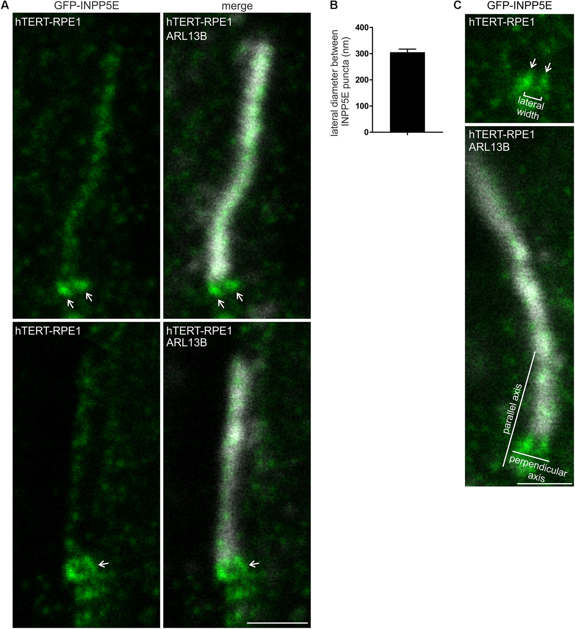 INPP5E exhibits a ring-shaped localization at the transition zone. (A) hTERT-RPE1 cells were transfected with GFP-INPP5E, serum starved and immunostained with GFP (green) and ARL13B (grayscale) antibodies and imaged by STED microscopy (confocal resolution image of the ARL13B stained axoneme is shown). Arrows indicate transition zone INPP5E localization, bar indicates 1 μm. (B) Graph shows the lateral diameter between the highest intensity points of the INPP5E transition zone protein puncta perpendicular to the plane of the axoneme. Bars represent mean ± SEM, n = 3 independent experiments, 30 cilia imaged per experiment and all cilia with two distinct INPP5E puncta measured. (C) Example image showing method for the lateral diameter and axial distance measurements, bar indicates 1 μm.