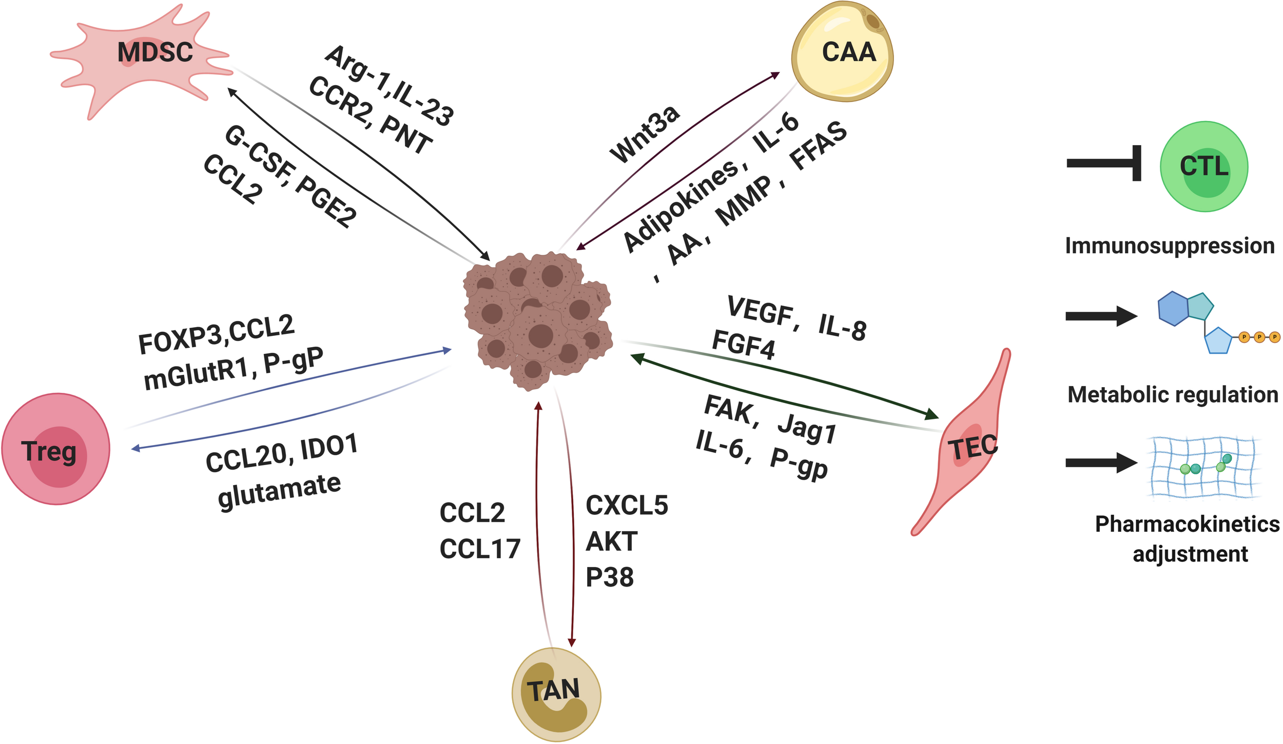 Figure 3. Interactions of tumor cells with parts of non-malignant cells within tumor microenvironments mediating drug resistance. Tumor microenvironment contains quantities of non-malignant stromal cells which are essential for tumor progression and drug resistance. Interactions between tumor cells and stromal cells polarize stromal cells. In turn, the stromal cells educated by tumor cells secret a variety of molecules, leading to immunosuppression, metabolic regulation and pharmacokinetics adjustment, which eventually weakens therapeutic efficacy. Arg-1, arginase-1; IL-23,interlukin-23; PNT, peroxynitrite; G-CSF, granulocyte-colony stimulating factor; PGE2, prostaglandin E2; FOXP3, forkhead box protein P3; mGlutR1, glutamate receptor 1; P-gP: P-glycoprotein, IDO1, indoleamine 2,3-dioxygenase; CAA: cancer associated adipocyte; FFAs: free fatty acids; AA: arachidonic acid; VEGF: vascular endothelial growth factor; FGF4: fibroblast growth factor 4; FAK: focal adhesion kinase. CTL, cytotoxic T lymphocytes. The figure was created with BioRender.com.