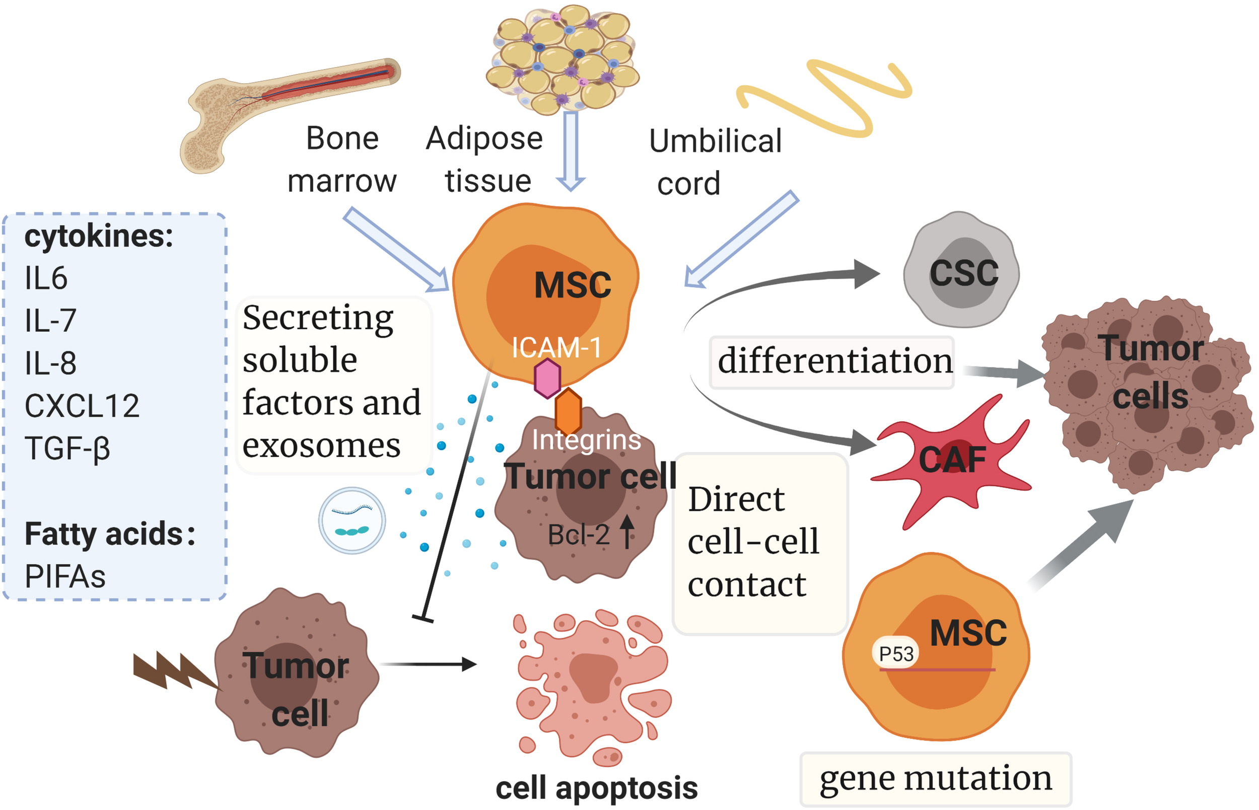 Figure 4. Mesenchymal stem cells and drug resistance. Mainly isolated from bone marrow, adipose tissue and umbilical cord, MSCs promote drug resistance in multiple ways, such as secreting soluble factors and exosomes, genetic mutations, direct cell-cell contact and differentiating into CAF or CSC. The diverse soluble factors and exosomes derived from MSCs could induce chemoresistance dependent on multiple pathways and downstream mechanisms, some of which relate to the inhibition of tumor cell apoptosis by regulating the expression of apoptosis-related proteins. It is noteworthy that chemoresistance properties of MSCs can be conferred via direct cell–cell contact with tumor cells as well. This interaction can enhance the expression of Bcl-2. Also, gene mutations such as p53 deficiency in MSCs could contribute to drug resistance by mediating antitumor immunity. Finally, MSCs have the potential to evolve into CAFs and CSCs, which have been reported to be involved in the development of resistance. MSC, mesenchymal stem cell; CSC, cancer stem cell; CAF, cancer-associated fibroblast; SDF-1: stromal cell-derived factor-1; TGF-β, transforming growth factor-β; PIFAs, platinum-induced fatty acids. ICAM-1, intercellular adhesion molecule-1. The figure was created with BioRender.com.