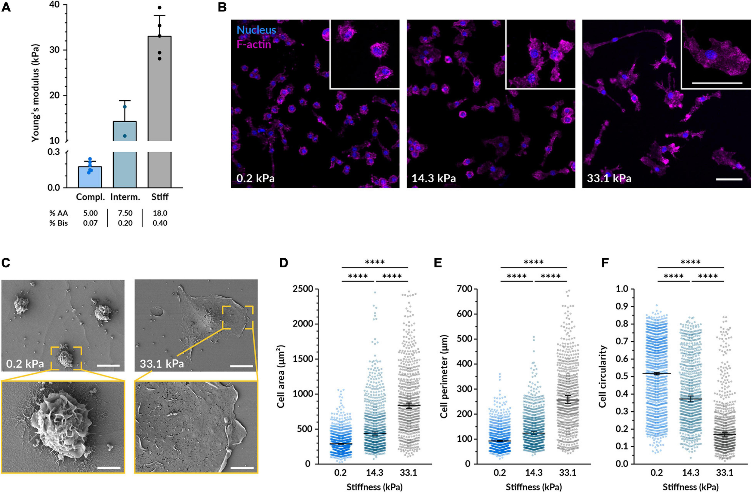 Macrophages are innate immune cells responsible for engulfing microbes and cell debris and orchestrating inflammatory responses to maintain tissue homeostasis. While patrolling within different organs and tissues, macrophages are exposed not only to multiple biochemical signals but also to mechanical cues, including tissue stiffness. For instance, microglia residing in the human brain are exposed to shear moduli of a few hundred Pa (Sack et al., 2008; Christ et al., 2010; Elkin et al., 2010), alveolar macrophages in the lung to a Young’s modulus of 2 kPa (Booth et al., 2012), macrophages within dermal tissue to shear moduli of 7–100 kPa (Wang et al., 2017) and bone osteoclasts face a Young’s moduli in the GPa range (Mirzaali et al., 2016). Moreover, pathological disorders such as tumors (Emon et al., 2018) or tissue fibrosis (Wells, 2013) can also promote changes in the stiffness range these and other immune cells encounter.